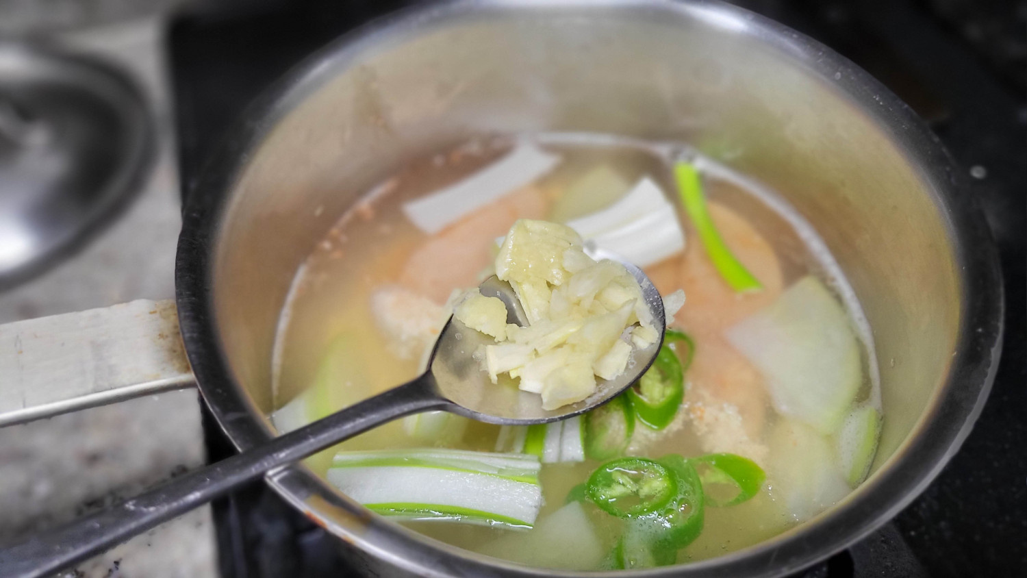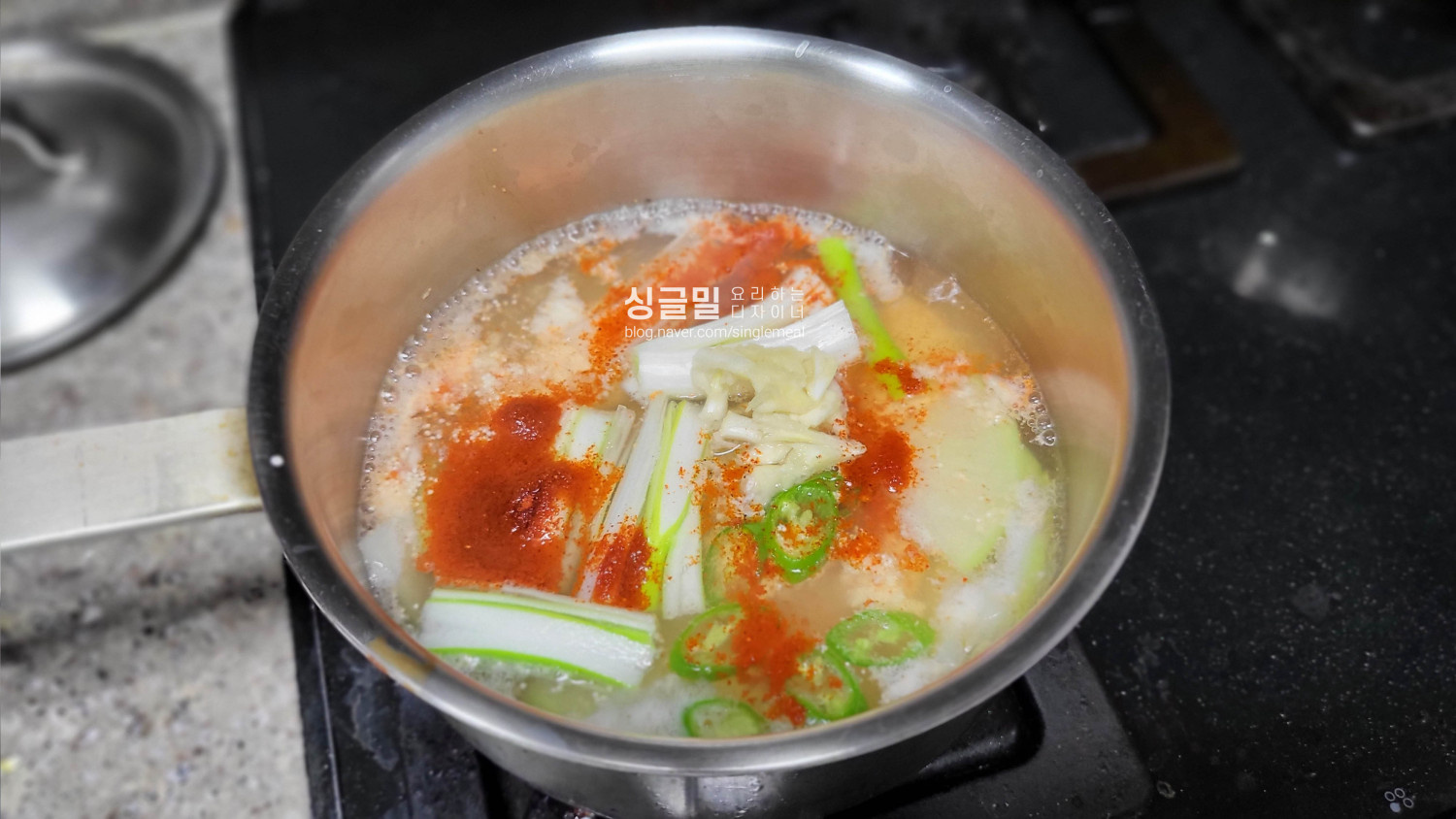 팔팔 끓이며 넣지 않는 이유는, 그렇게 물살이 일며 끓을 때 넣으니 명란이 잘 풀어졌다.