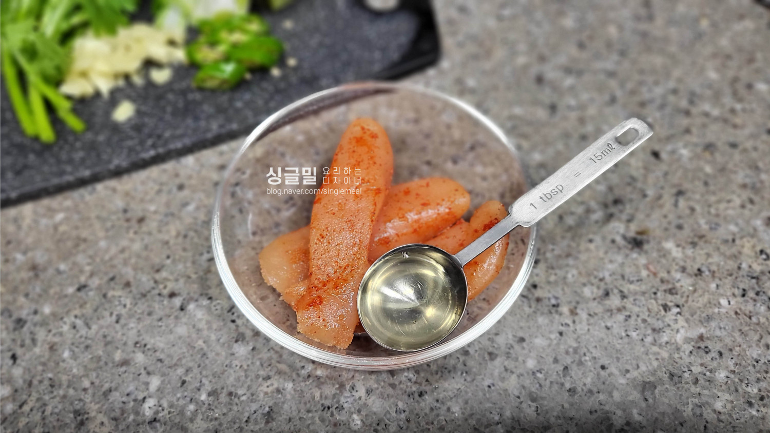분량의 재료를 준비하고, 명란에 맛술을 뿌려서 잠시 두면 비린내가 제거된다.