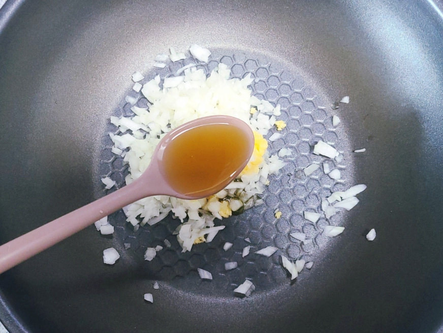 볶음팬에 양파와 다진마늘, 들기름 1큰술을 넣고 가스불 중불에서 양파의 숨이 죽을 정도로 볶아줍니다.
