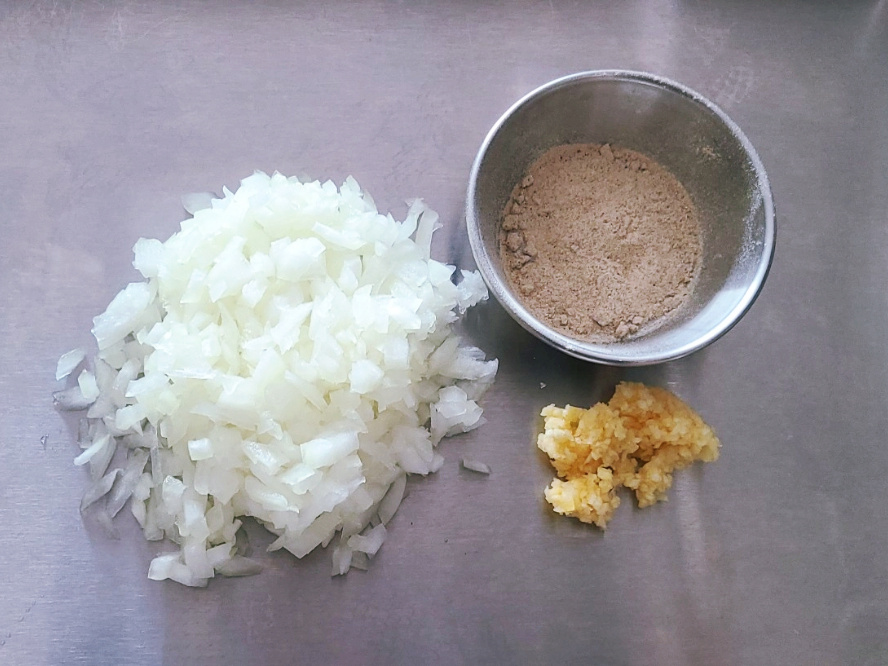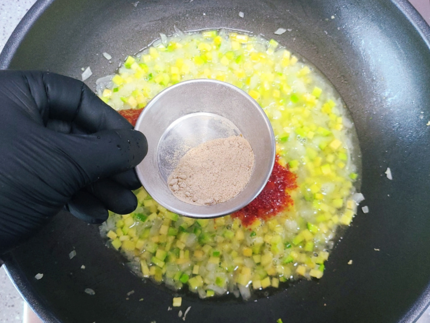 두부 120 g , 애호박 95 g , 양파 65 g (밥 숟가락계량), 물 100 ml (밥 숟가락계량), 동전육수(가루분말) 1 개 , 들기름 1 큰술 (밥 숟가락계량), 시판 된장 2 큰술 (밥 숟가락계량), 쌈장 1 큰술 (밥 숟가락계량), 설탕 0.3 큰술 (밥 숟가락계량), 고춧가루 0.4 큰술 (밥 숟가락계량), 다진마늘 0.5 큰술 (밥 숟가락계량), 통깨 솔솔솔