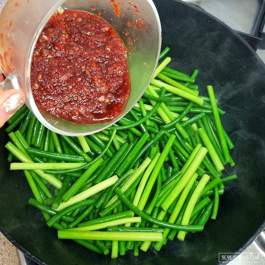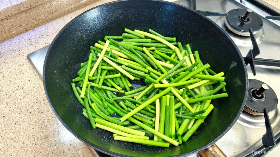 중불에서 달달 볶다 보면 마늘 향이 은은하게 올라오면서 초록색이 더 선명해져요.
