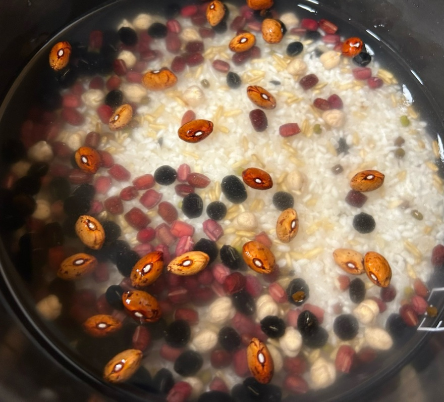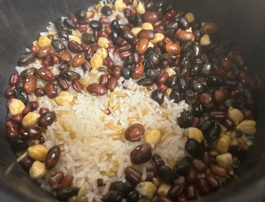 팥이 다른 잡곡에 비해 단단한 편이라 미리 한번 삶아서 사용하고 팥을 삶은 물을 밥물로 사용하면 밥의 색감도 더 곱고 팥의 풍미도 더 진하게 느껴지는데 저는 그냥 깔끔한 팥잡곡밥을 원해서 팥물은 생략하고 일반 물로 밥을 지었어요.