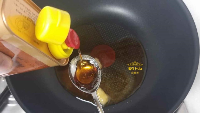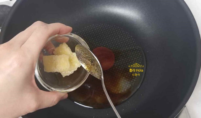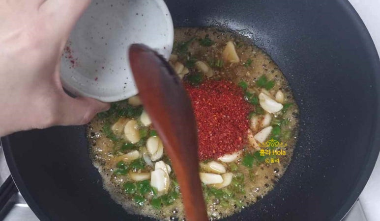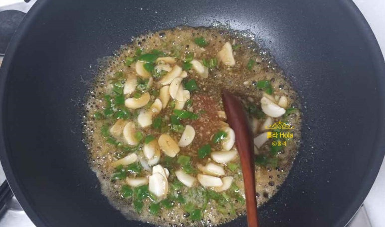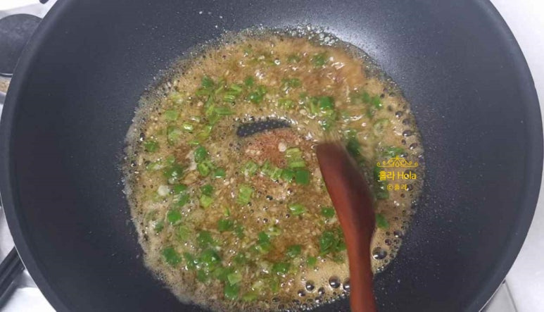 양념장을 만들고, 골고루 섞은 후, 센불로 끓입니다.