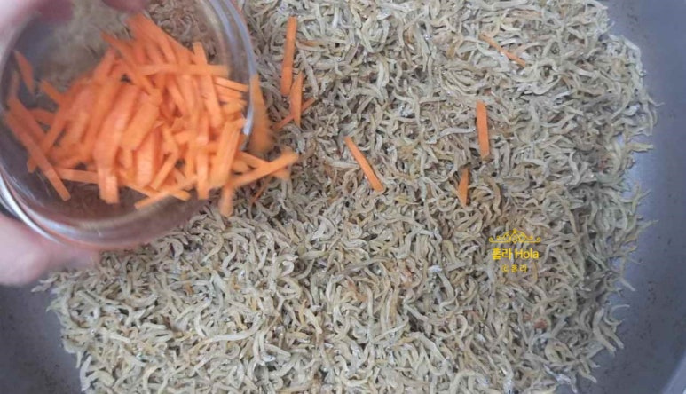 잔멸치 300 g , 편썬 통마늘 , 채썬 당근 , 식용유