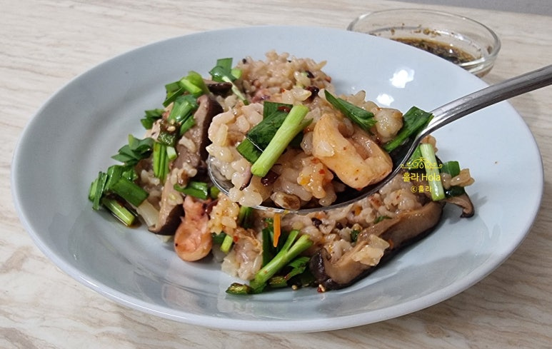 쌀 3 컵 (컵: 전기압력밥솥컵 기준), 잡곡 1 컵 , 물 4 컵 (버섯 우린 물 포함), 다시마 3 조각 (1g), 굵게 채썬 무 60 g , 자숙 문어 360 g , 채썬 당근 15 g , 청주 1 T , 건표고버섯 5 개 (물에 불렸다가 기둥을 제거하고 채썰어서 준비), 쯔유 2 T , 참기름 2 T , 송송썬 부추