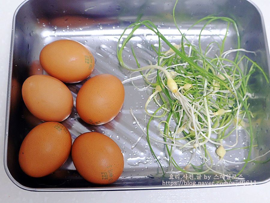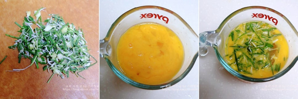 달래는 잘게 다진 후 계란 풀어놓은 것에 넣고 잘 섞어줍니다