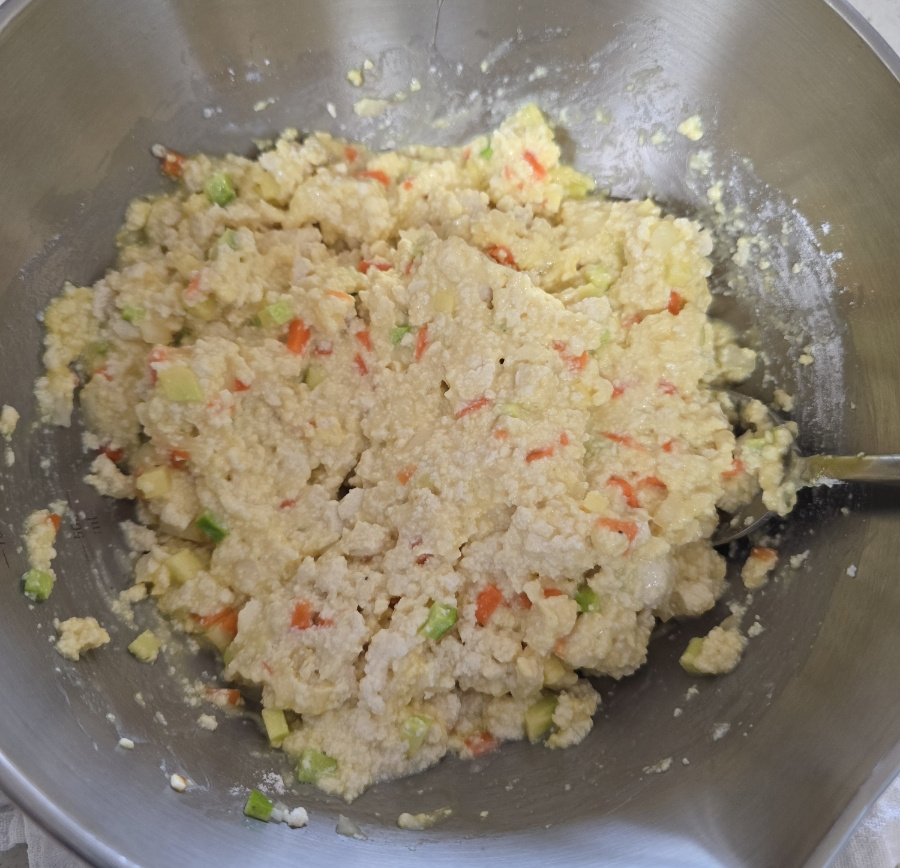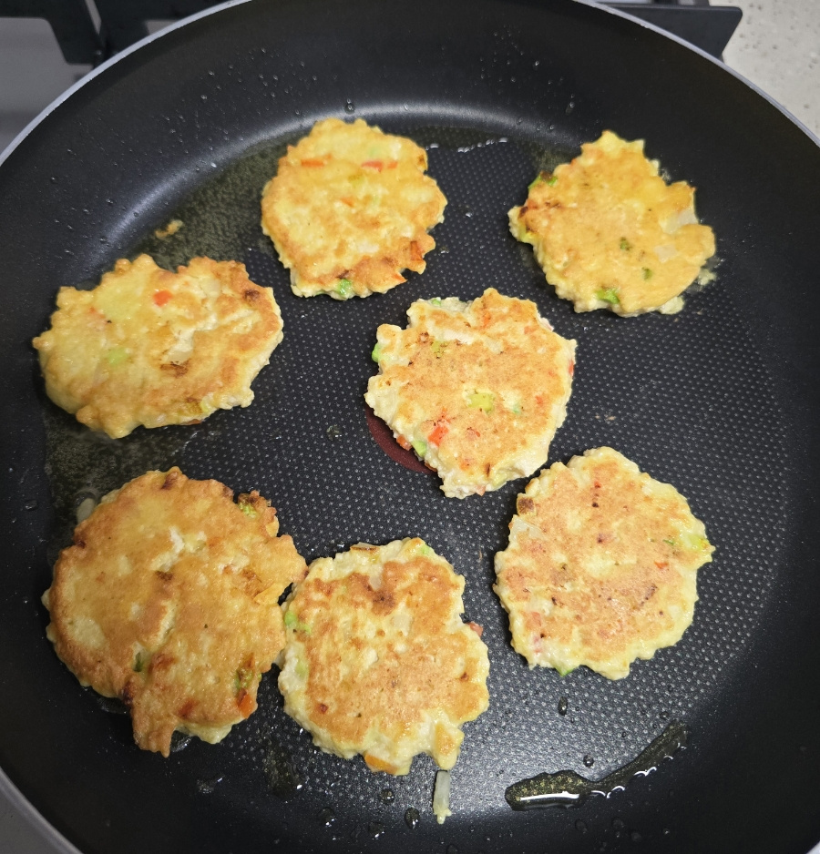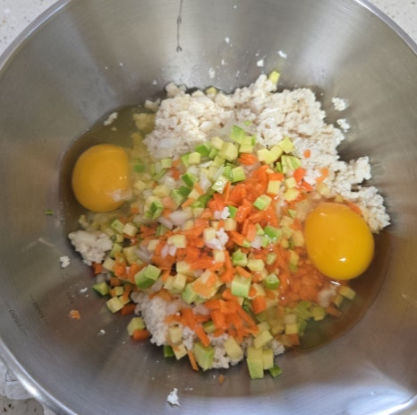 두부 1모 계란 두 알 삼총사 채소 : 양파 당근 애호박 적당히 전분가루 1 소금 후추 약간 올리브유 적당히 , 계량 : 밥숟가락