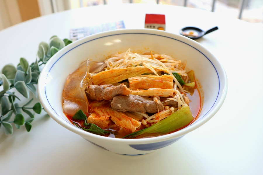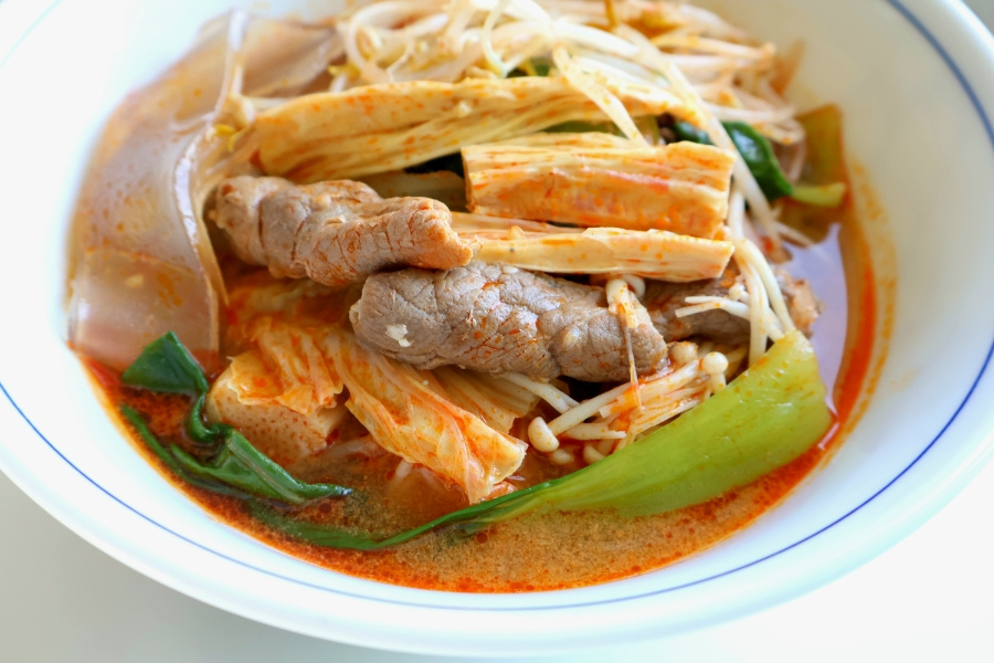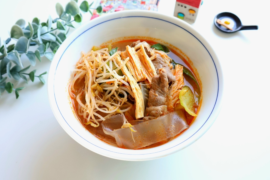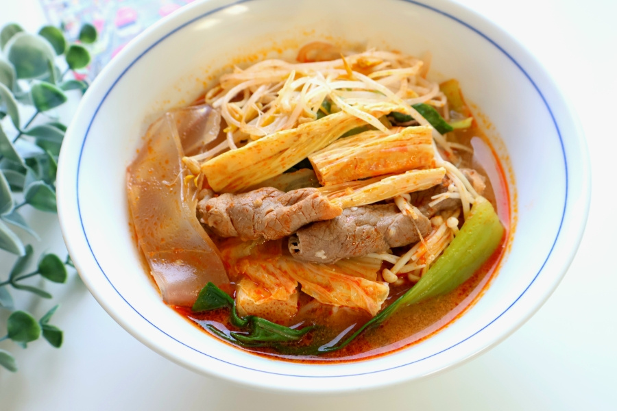 단백질 : 소고기 샤브샤브용 어묵 비엔나소시지 채소 : 청경채 배추 숙주 팽이버섯 핵심 : 푸주 넓적당면 육수 : 시판용 사골육수 500ml 물 300ml 대파 1대 다진 마늘 1 고추기름 2 마라 소스 6 (100g 정도) , 계량 : 밥숟가락