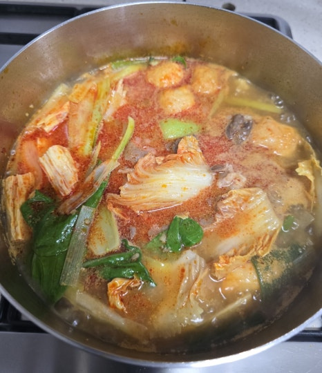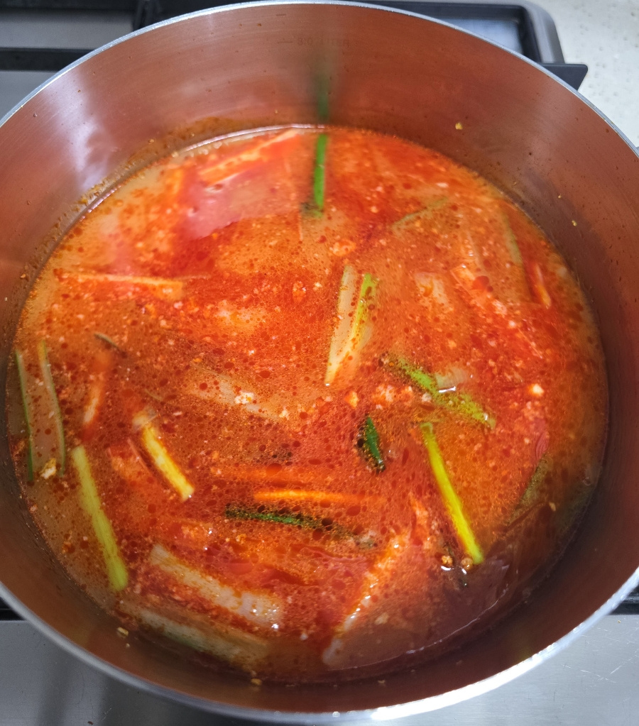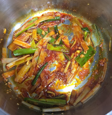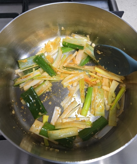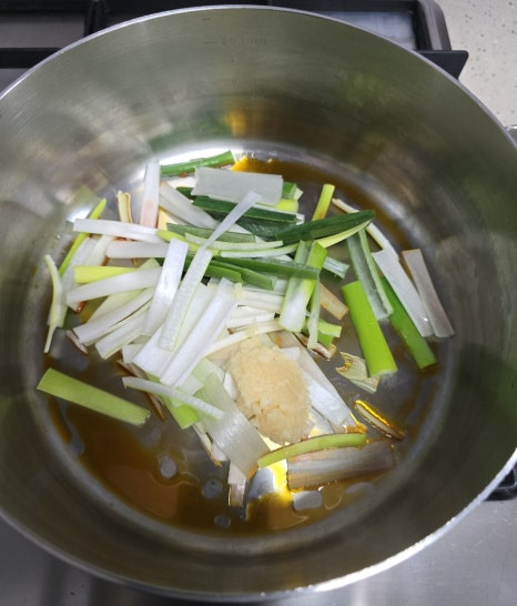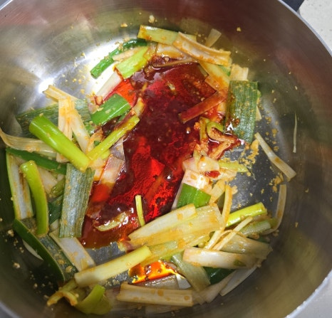 냄비에 고추기름을 두르고 다진 마늘이랑 대파를 볶아봐요.