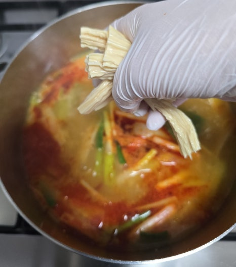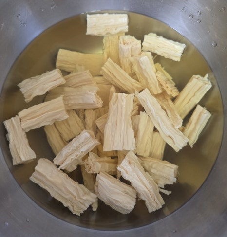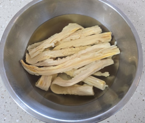 푸주를 뜨거운 물에 2시간 정도 푹 담가주면 아주 야들야들하니 간이 쏙 잘 배는 상태가 되어요.