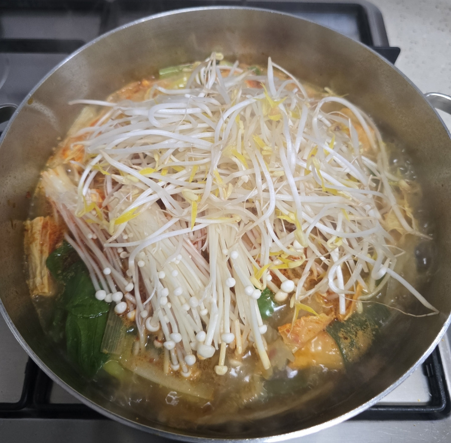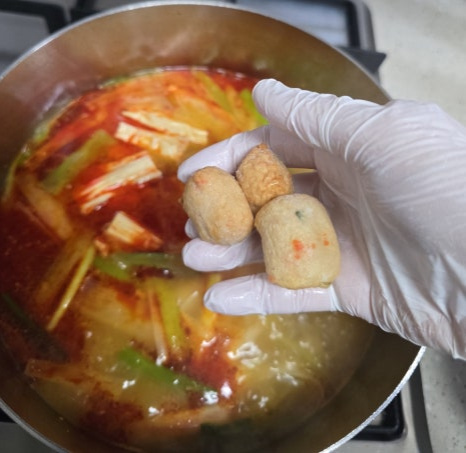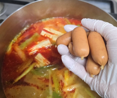 물이 끓기 시작하면 잘 안 익는 당면, 푸주, 어묵, 소시지부터 먼저 넣고~
