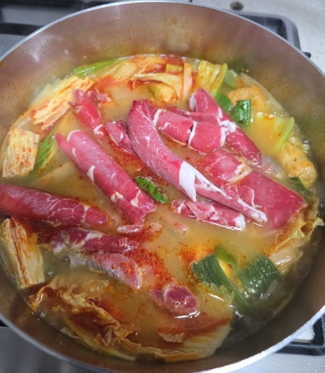 팔팔 끓을 때 고기를 하나씩 넣고 익혀줍니다.