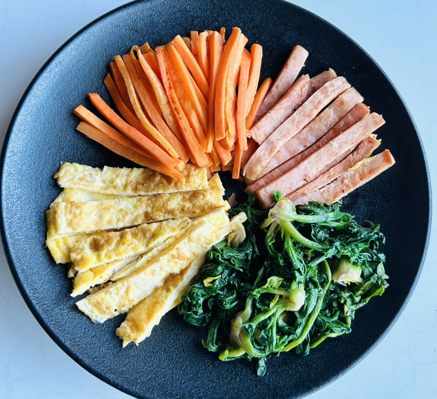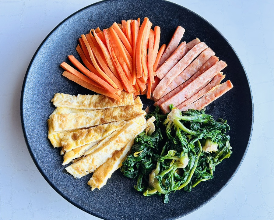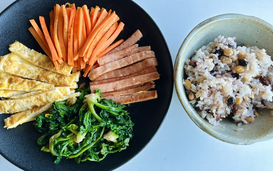 시금치 1단 , 당근 1개 , 계란 3개 , 스팸 1/2캔 , 유자무장아찌 2큰술 , 재래김 4장 (2장씩 사용), 밥 2공기 , 참기름 약간 , 참깨 약간