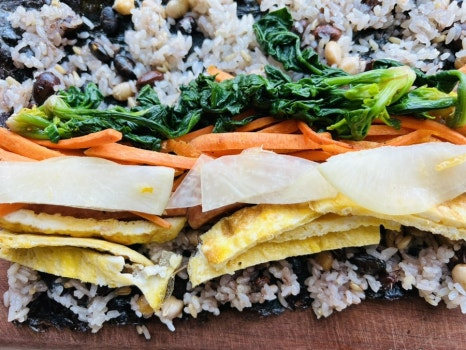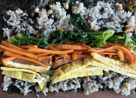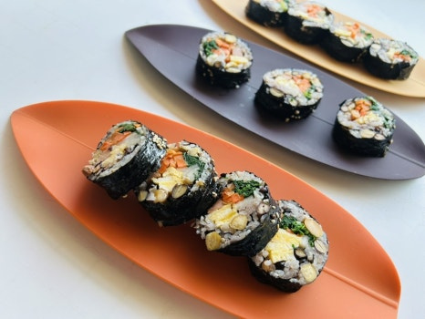 김밥의 초록색 야채로는 겨울 시금치가 특유의 단맛과 향이 있어 젤 잘 어울리는데 겨울이 아닌 계절엔 그 맛을 낼 수 없어 깻잎이나 상추등 그 때 그 때 제철 채소를 활용하게 되요.