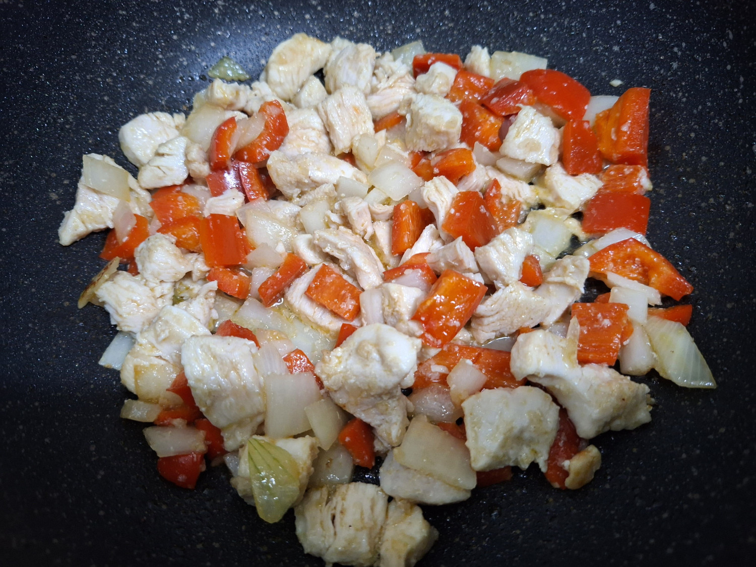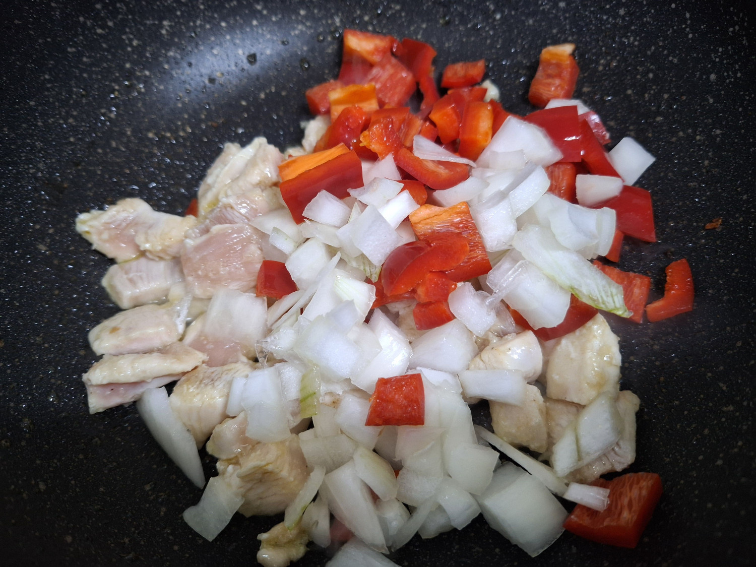 1분 후에 썰어둔 빨간 파프리카와 양파를 넣고