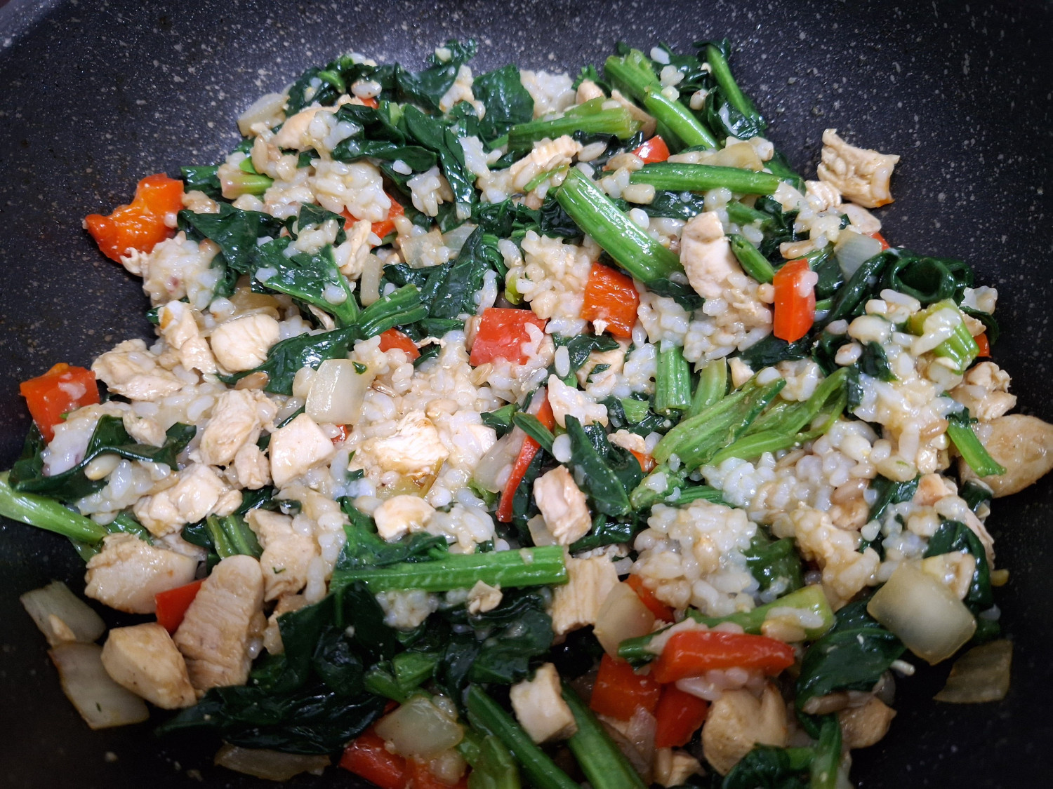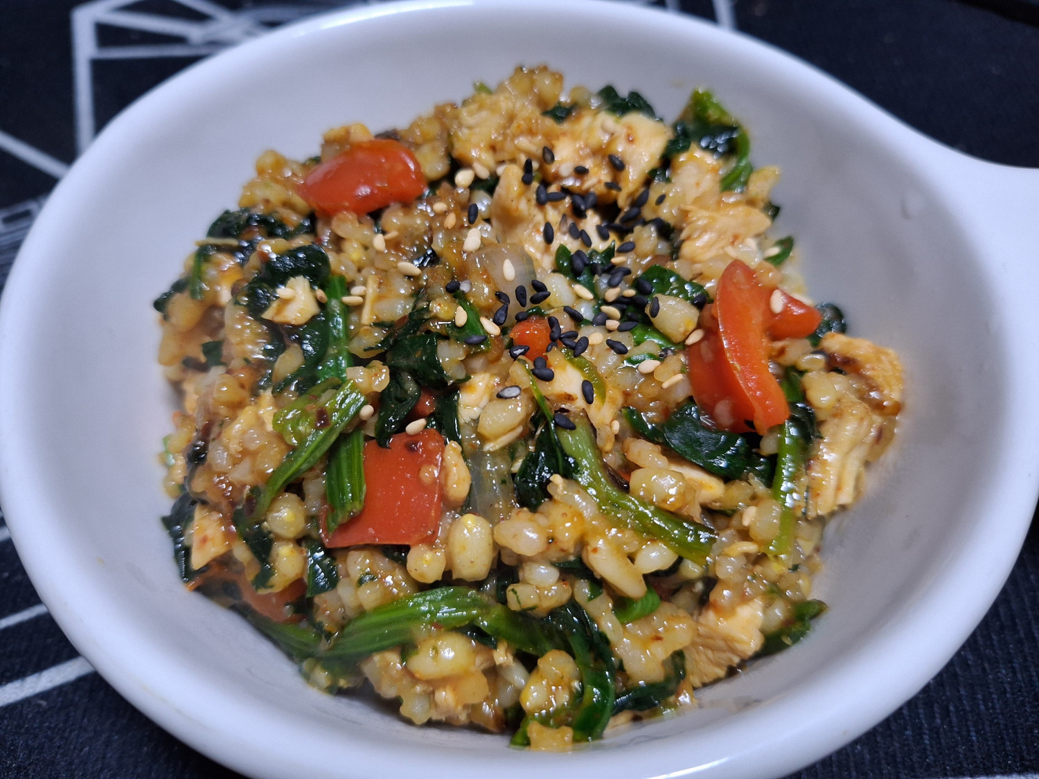 시금치 200 g , 빨간 파프리카 1/2 개 , 양파 1/4 개 , 청양고추 1/2 개 , 잡곡밥 한공기