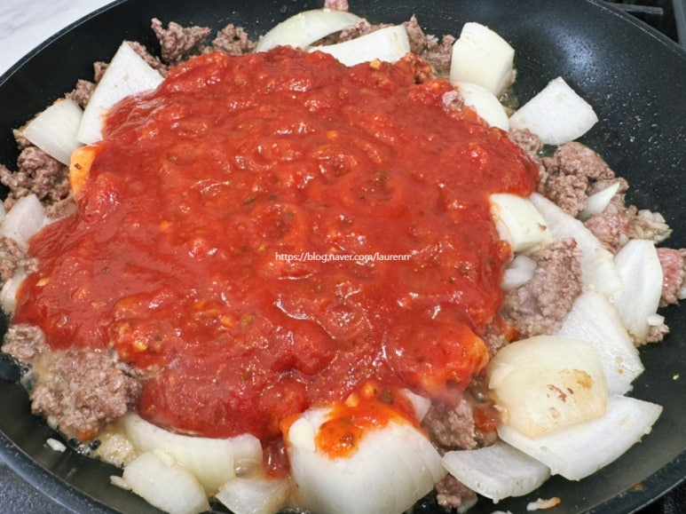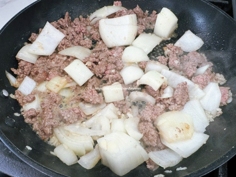유기농 소고기 다짐육 200g 양파 1/2개 다진마늘 1큰술 올리브 오일 조금 버터 조금