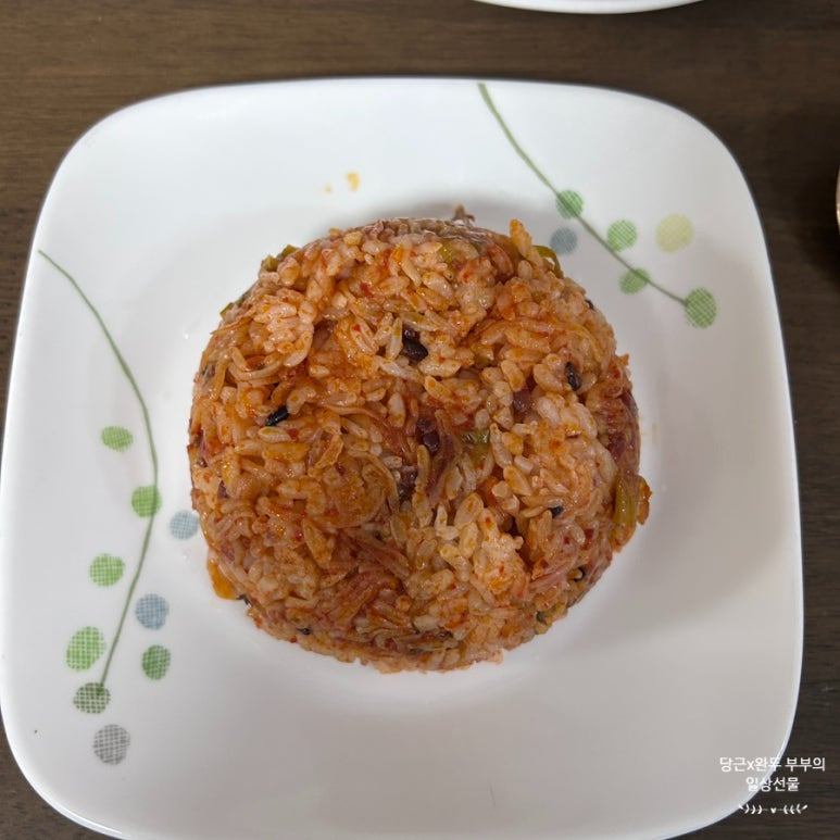 밥 2공기를 넣고 잘 볶은 후, 오목한 밥그릇에 담아 모양을 내고, 접시로 덮어 뒤집어주세요.