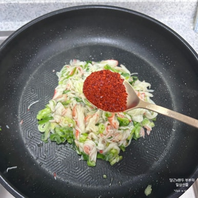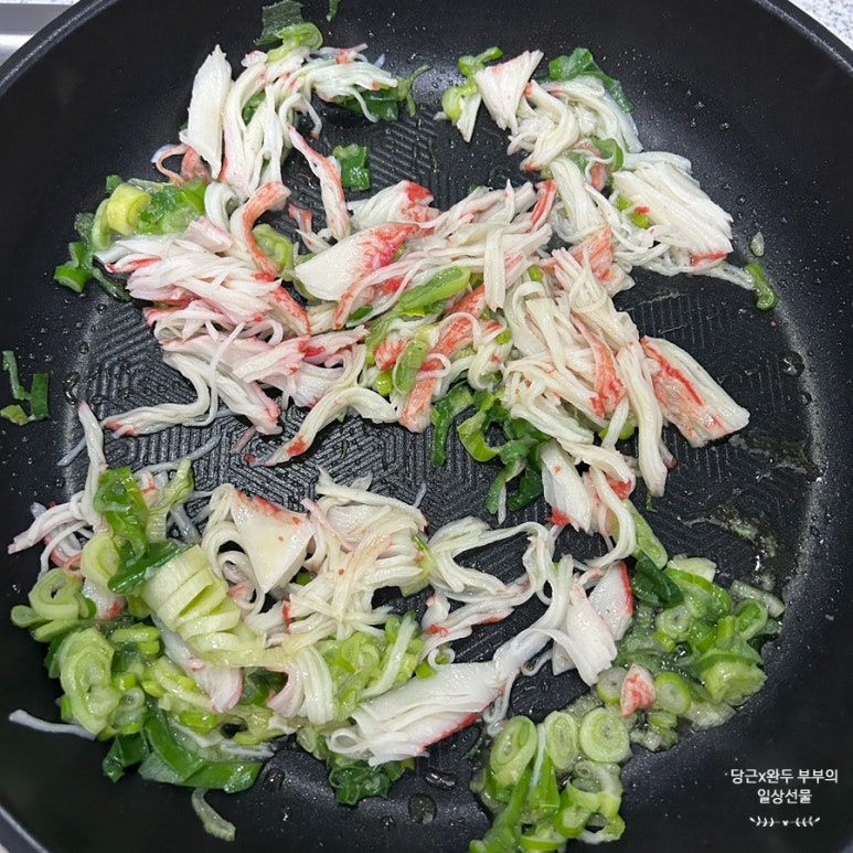 대파가 투명해지면 잘게 찢은 게맛살을 넣고 대파가 노릇해질때까지 볶아주세요.