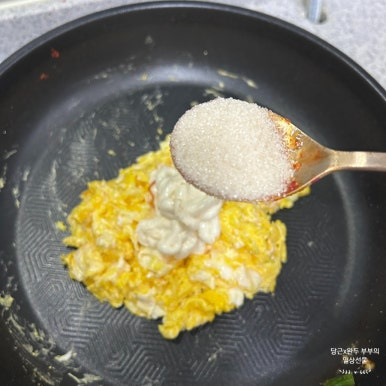 달걀이 아직 촉촉할 때 불을 끄고 잘게 부수며 잔열로 익혀 주세요.