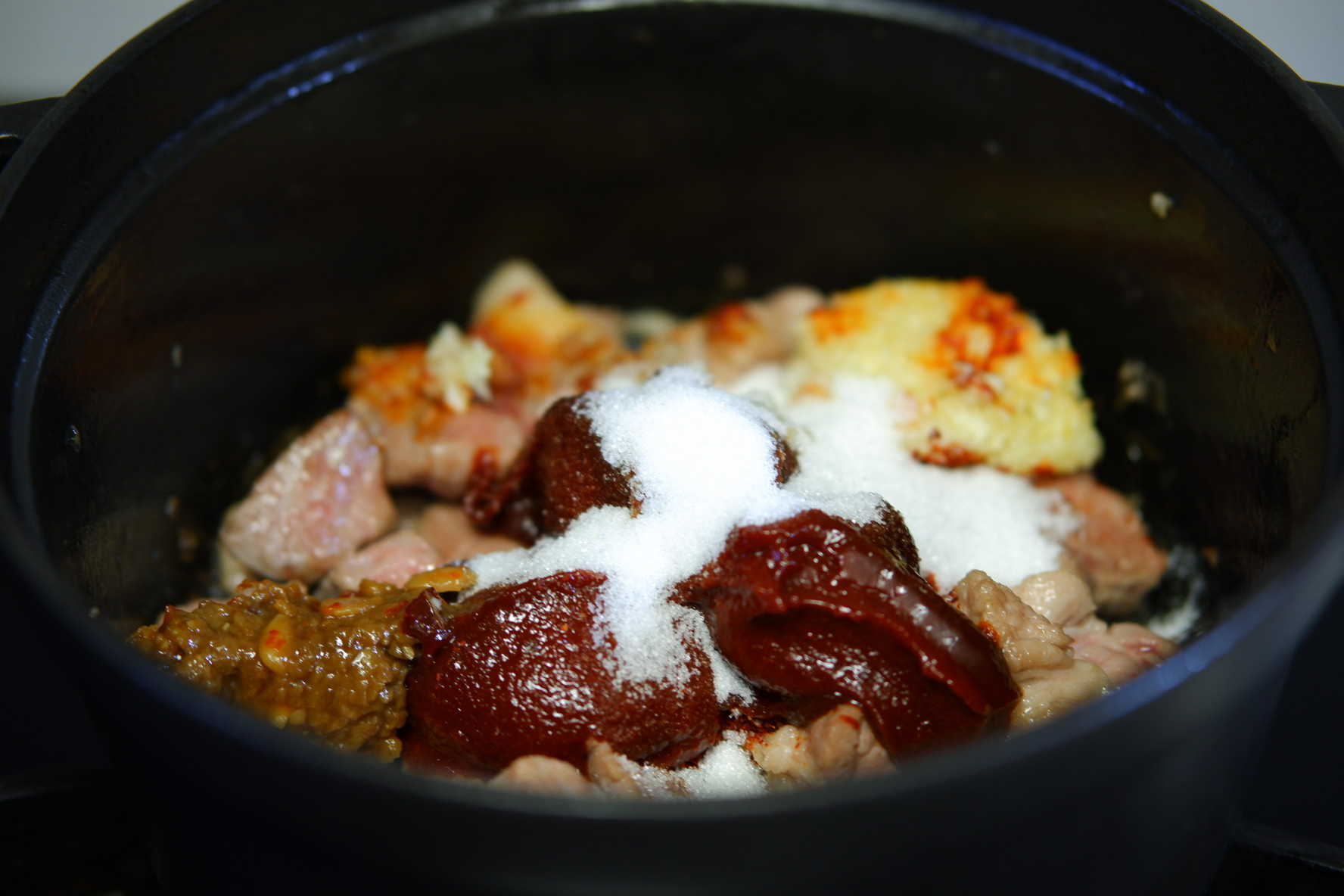 냄비에 기름 약간 넣고 목살부터 익혀 주시다가 분량에 고추장찌개에 양념을 넣고 목살과 어우러지도록 볶아 주신 후 물 800ml와 한알육수 2개 감자 넣고 끓여주세요.