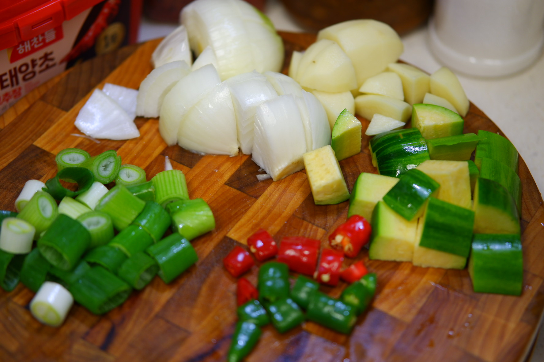 애호박, 감자, 양파는 먹기 좋게 썰고 대파와 청양고추는 듬성듬성 썰어주세요.