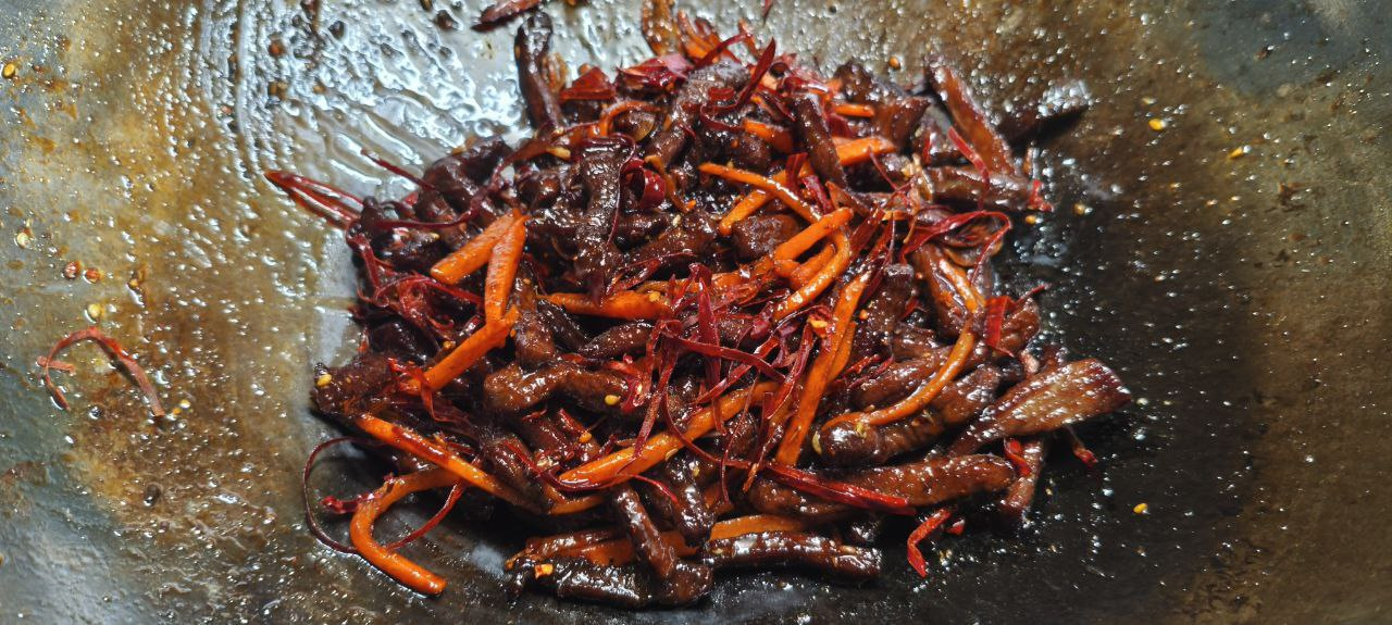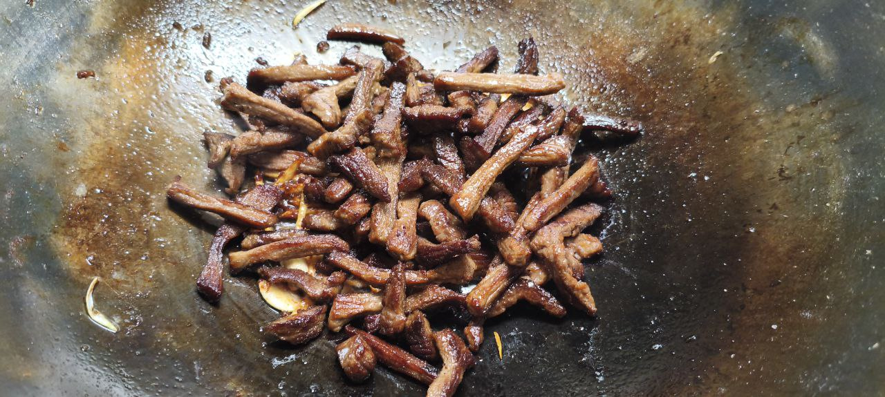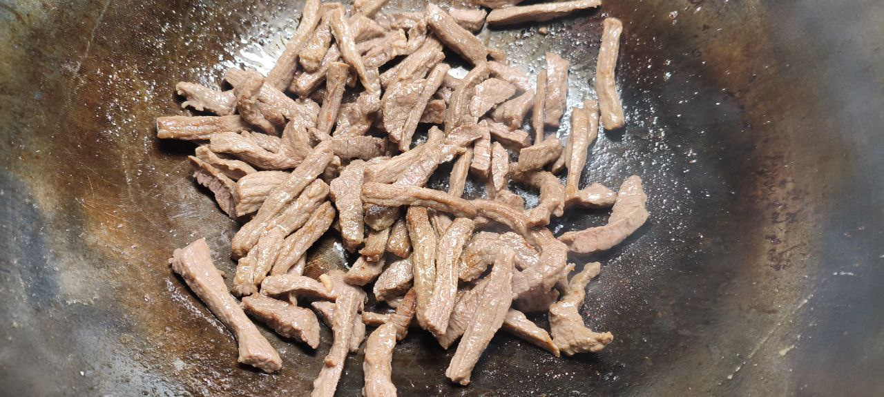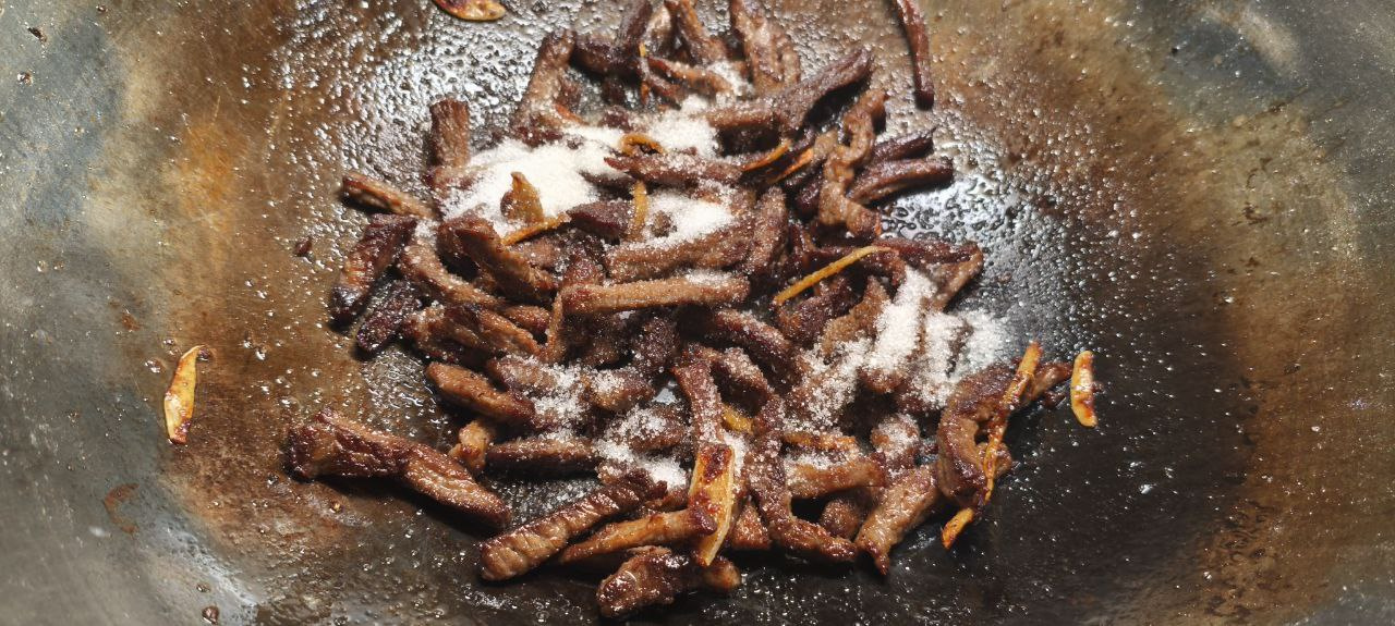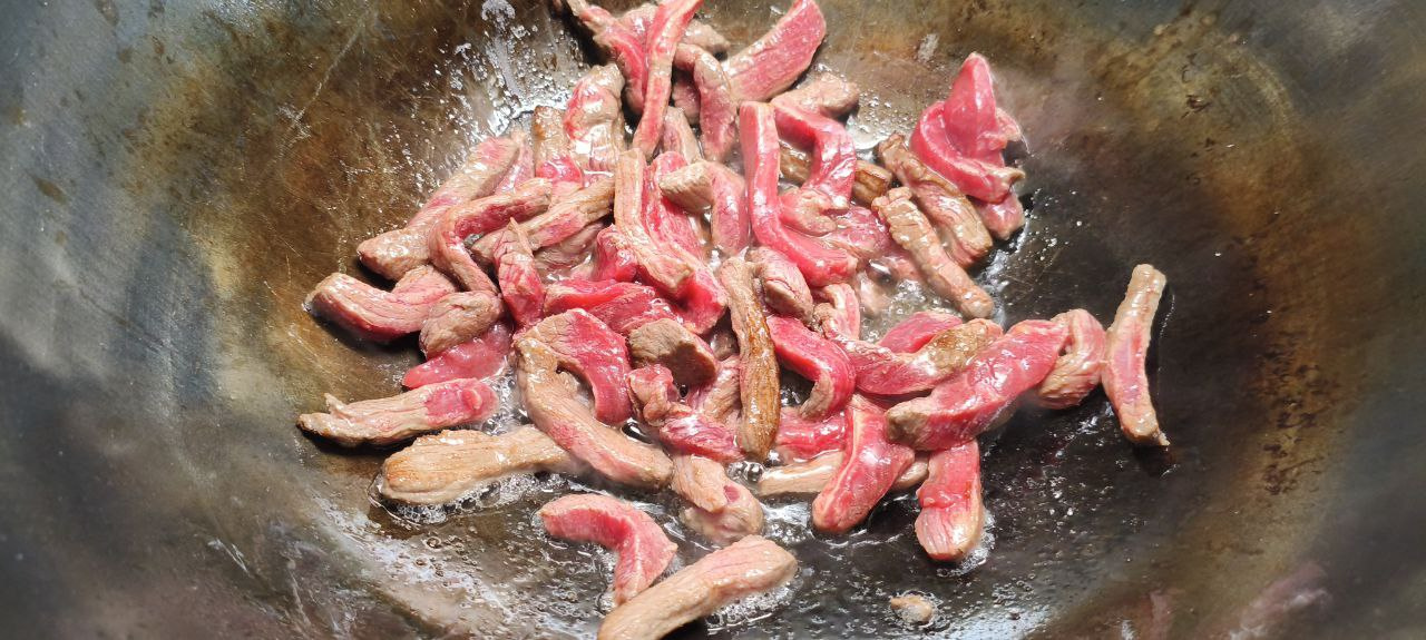와기에 기름을 두르고 고기를 넣으세요. 5-7분 정도 볶으면서 저어주세요. 5-7분 후에 물을 빼고, 고기를 갈색이 될 때까지 한 번 더 볶아주세요. 고기를 접시에 담아 주세요.