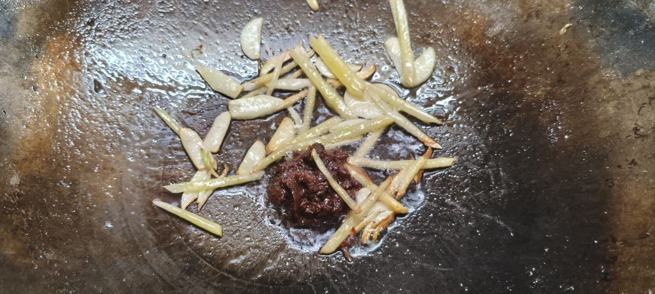 뜨거운 기름에 마늘과 생강을 볶아 향을 내세요 (1분). 고추기름과 섞은 된장 양념을 넣고 1분간 볶아주세요. 고기를 넣고 골고루 섞으며 2-3분간 볶아주세요.설탕 한 스푼 넣고 1분 저어가며 볶으세요.