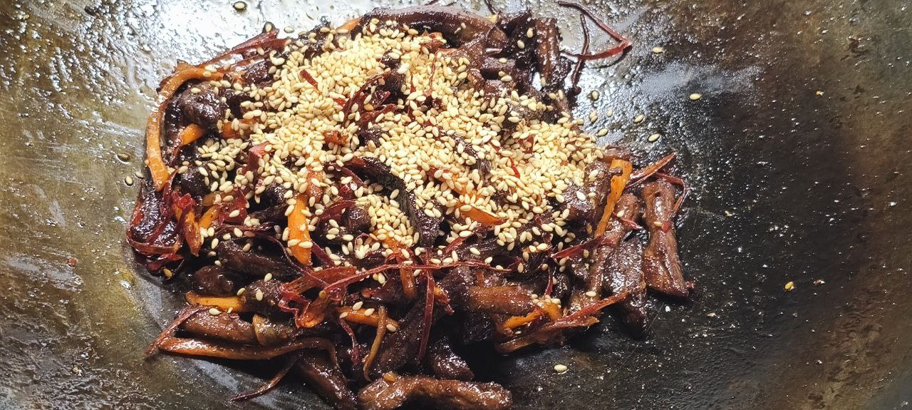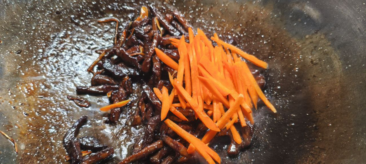 간장 반 큰 술을 넣고 골고루 섞은 뒤 1분간 볶으세요. 간장 반 큰 술을 추가로 넣고 다시 볶아주세요. 당근을 추가한 뒤 모든 재료가 고루 섞일 때까지 볶으세요 (1-2분 정도). 다음으로 채 썬 매운 건고추를 넣고 골고루 섞은 후, 참기름을 넣어 1분간 볶아주세요. 와키 불을 끄고, 참깨를 뿌려 섞은 후 맛있게 드세요
