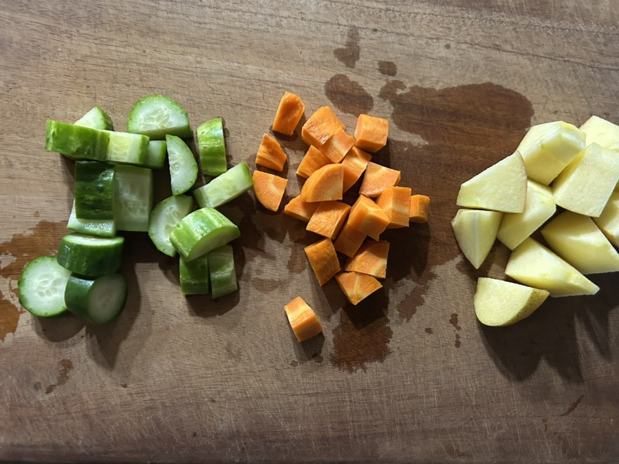 오이와 당근을 손질해 씻어 한입 크기로 썰어 주세요.