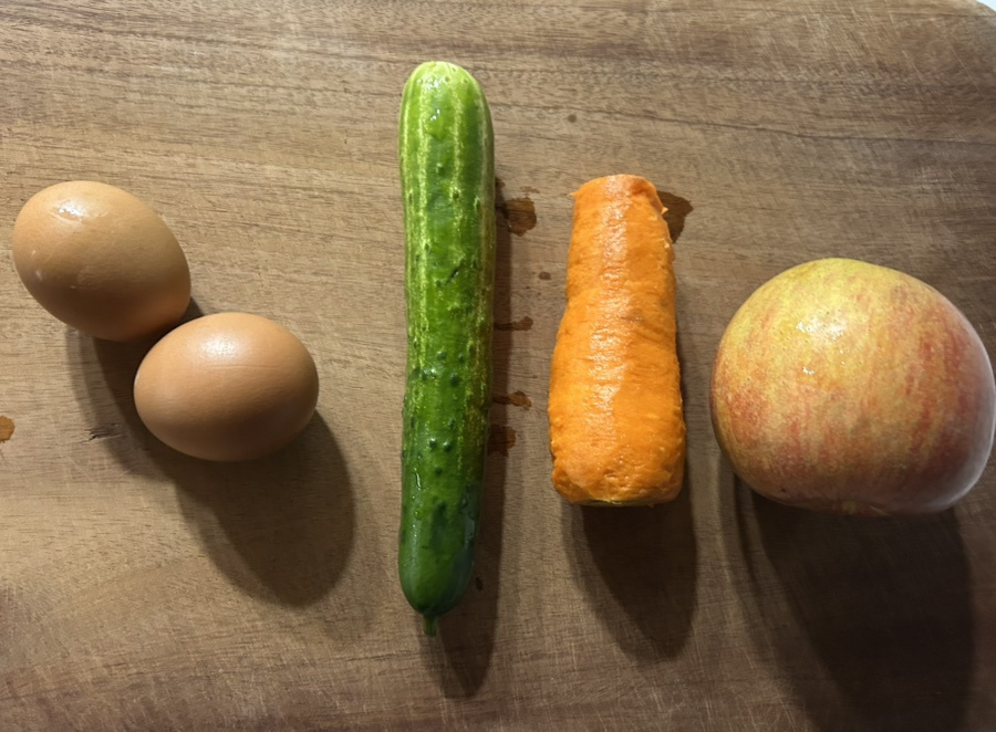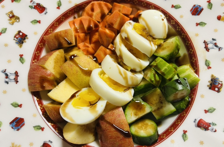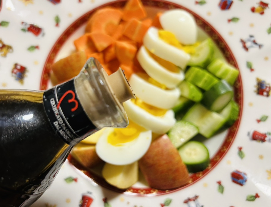 반숙계란 2개 , 당근 1/2개 , 오이 1개 , 사과 1개 , 발사믹식초 약간