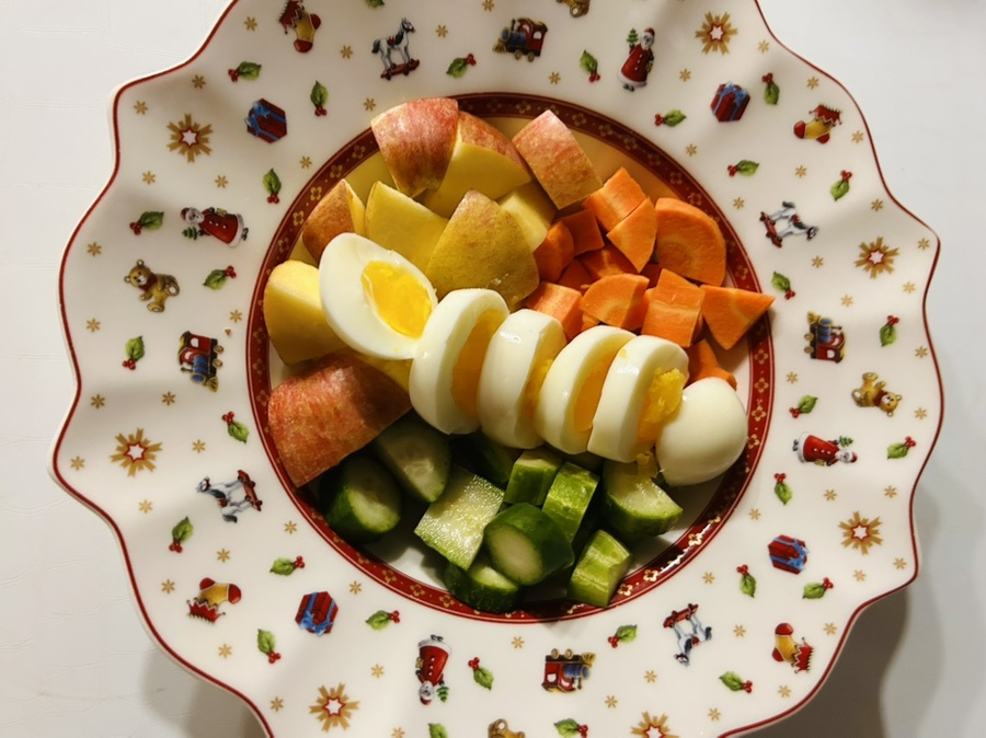오늘 아침 샐러드는 반숙계란과 사과, 당근, 오이를 준비해서 영양과 다이어트를 둘 다 챙기는 한끼예요.