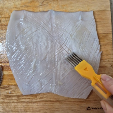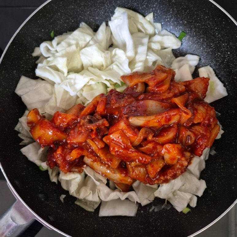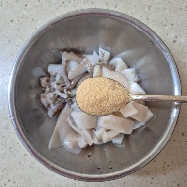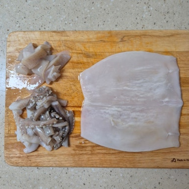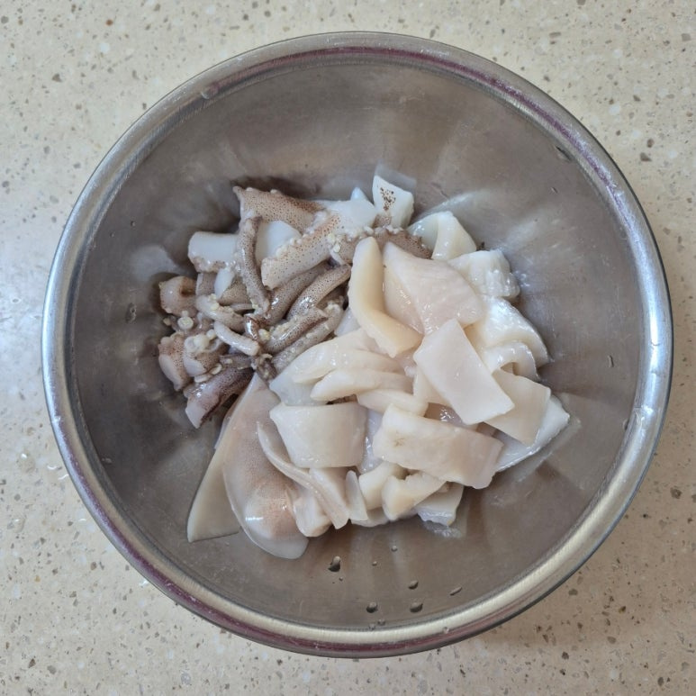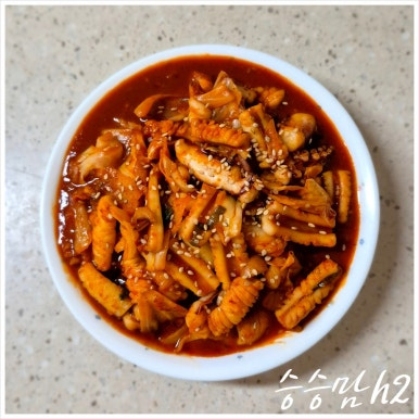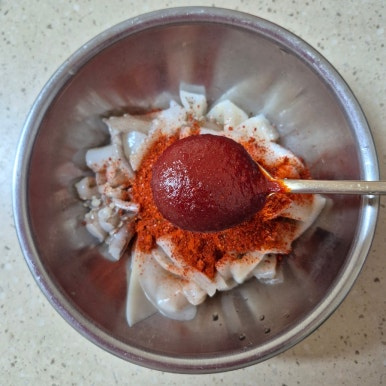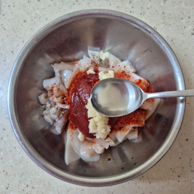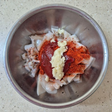 오징어 1마리, 설탕 1큰술, 고춧가루 1큰술, 고추장 1큰술, 다진 마늘 1작은술, 청주 1큰술, 간장 2큰술, 후춧가루 약간
