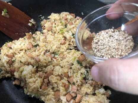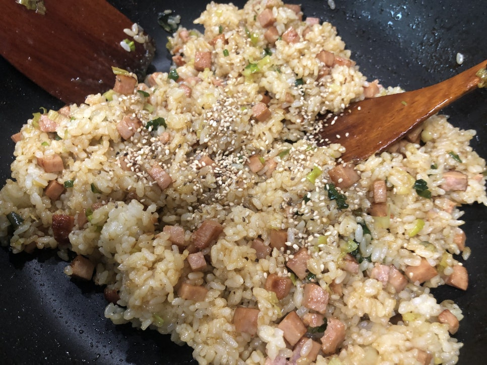 밥알이 잘풀렸으면 불을 끄고 참기름(1스푼), 통깨(1스푼)(통깨는 절반만 넣어주세요) 을 넣고 밥을 볶아줍니다.