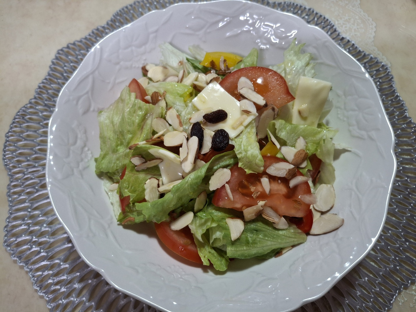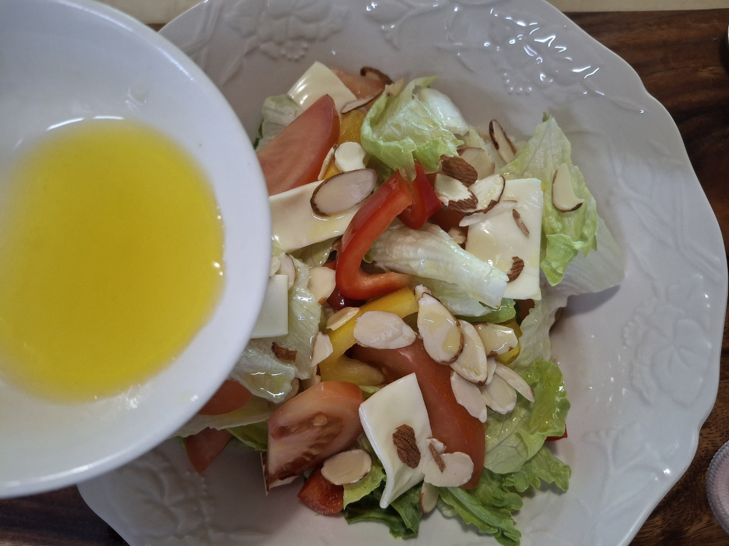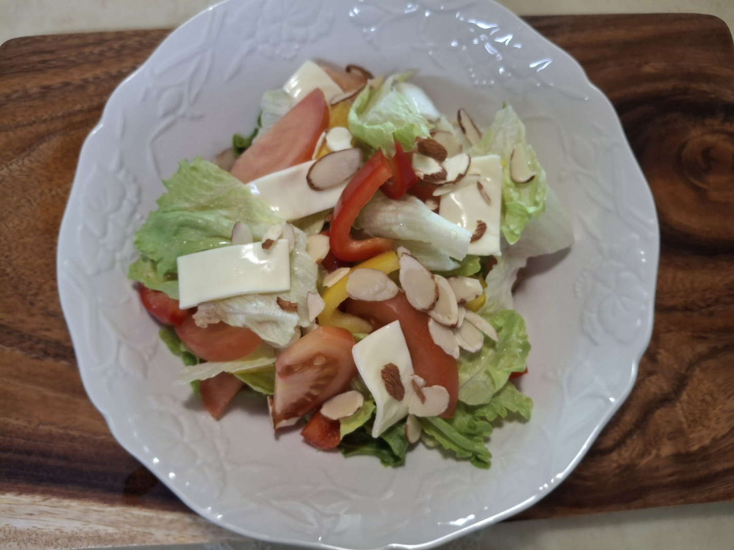 양상추 70g, 토마토 100g, 파프리카 (노랑, 빨강 각) 1/4개, 아몬드 슬라이스 20g, 치즈 1장
