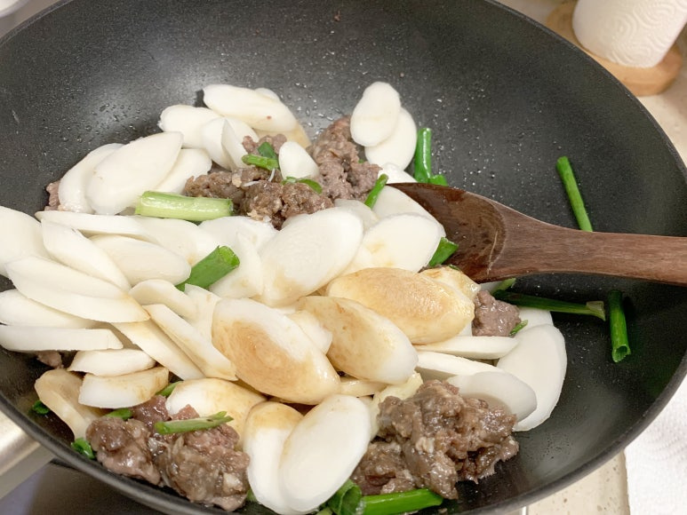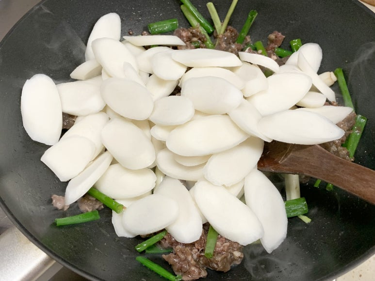 고기가 뭉쳐지지 않도록 으깨면서 볶다가 떡국떡을 넣어 줍니다.