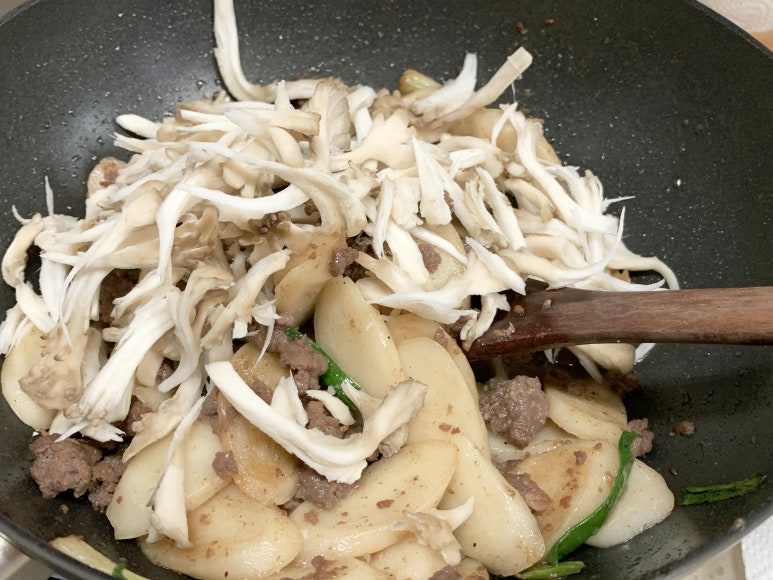 잎새버섯을 넣어 준 후 잘 볶다가 불을 끕니다.