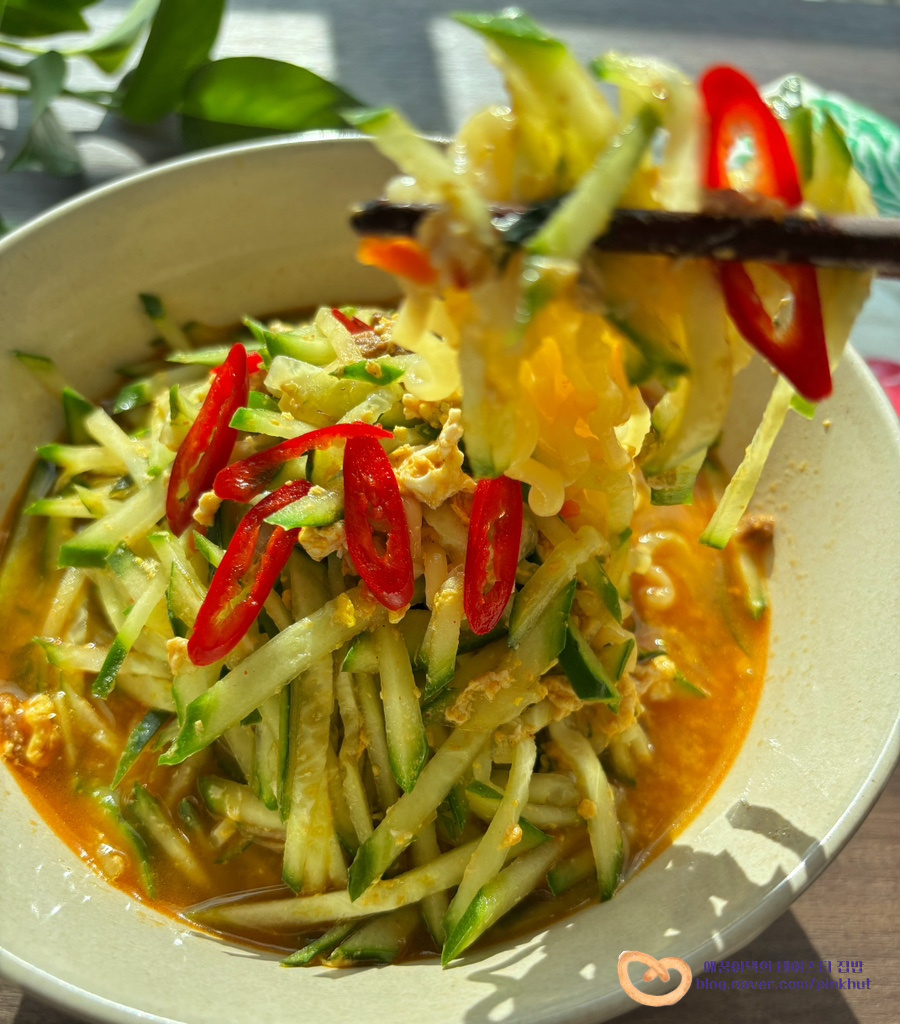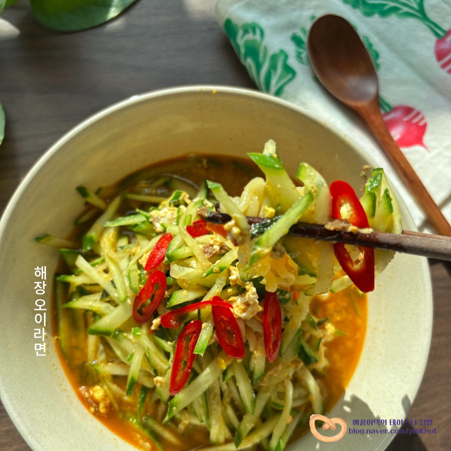 아삭한 오이와 시원한 라면 국물이 속을 편안하게 해 주더라고요. 자극적이지 않으면서 해장되는 기분을 느낄 수 있어서 해장음식 찾으시는 분들도 꼭 만들어 보세요