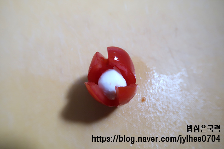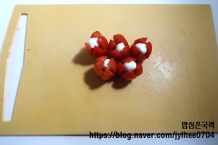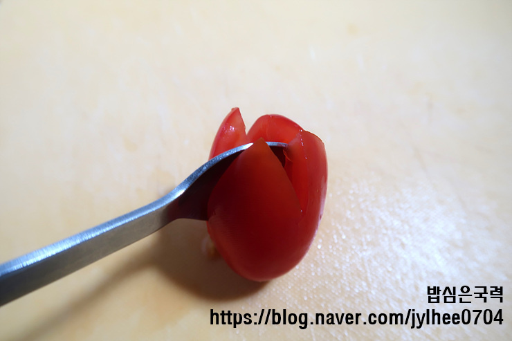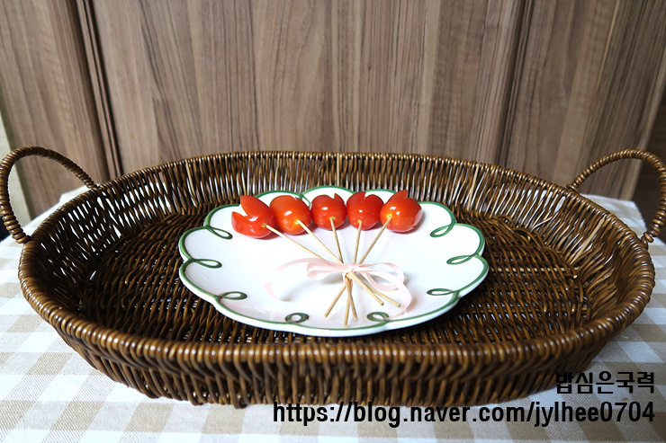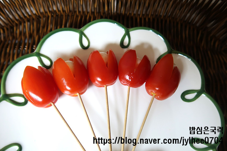 안녕하세요? 밥심은 국력입니다. 대추 방울 토마토는 일반 방울 토마토보다 과육이 단단하고 단맛 이 진해 꽃 모양을 만들기에 잘 어울려요. 대추 방울 토마토 효능 대추 방울토마토는 라이코펜이 풍부해 항산화 작용을 돕고, 피부 노화 예방과 혈관 건강에 좋아요. 비타민 C와 수분이 많아 피로 회복과 면역력 관리에도 도움을 주며, 달콤한 맛 에 비해 칼로리가 낮아 가볍게 즐기기 좋은 과일이에요. 그럼 만들어 볼게요.