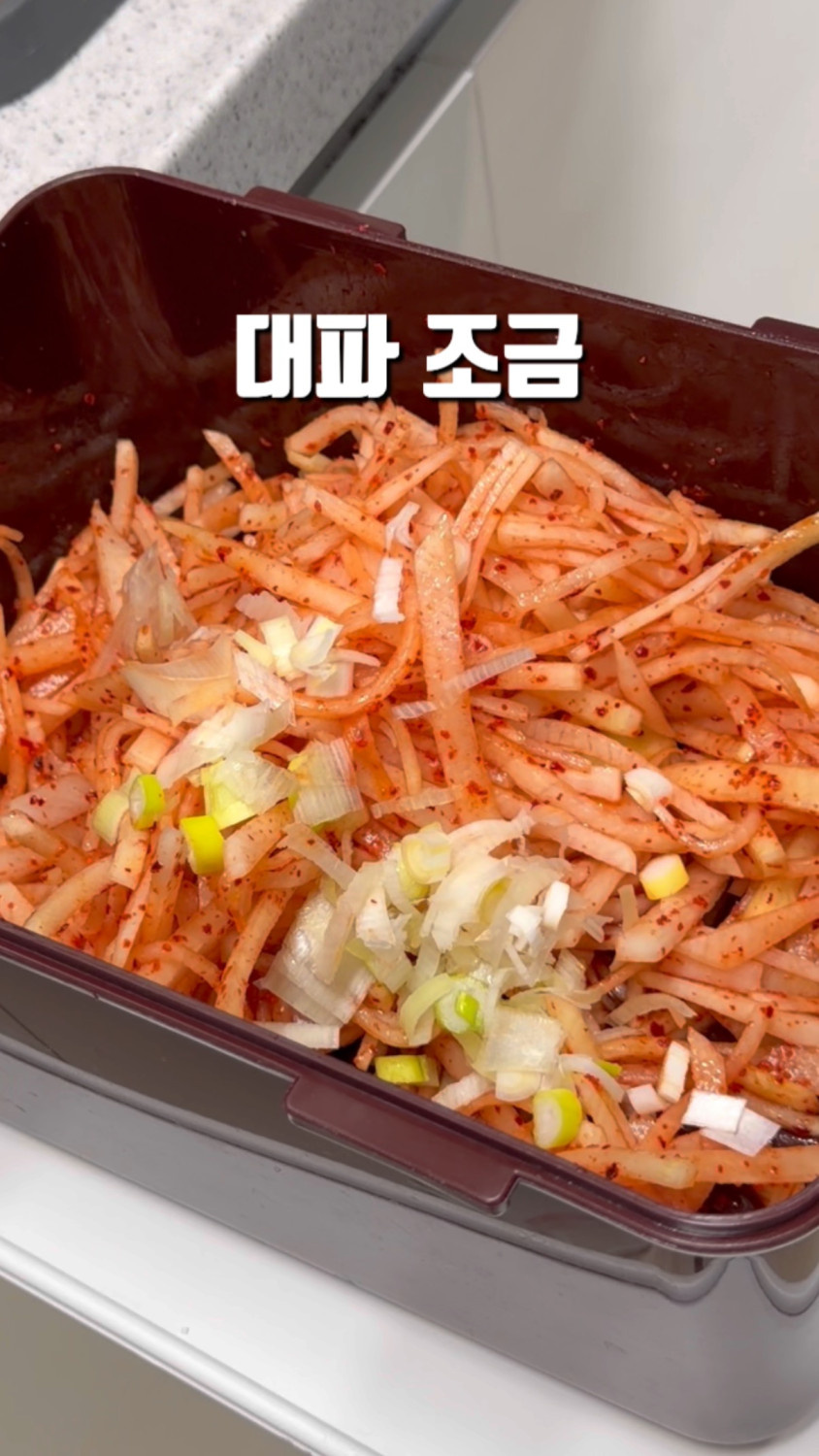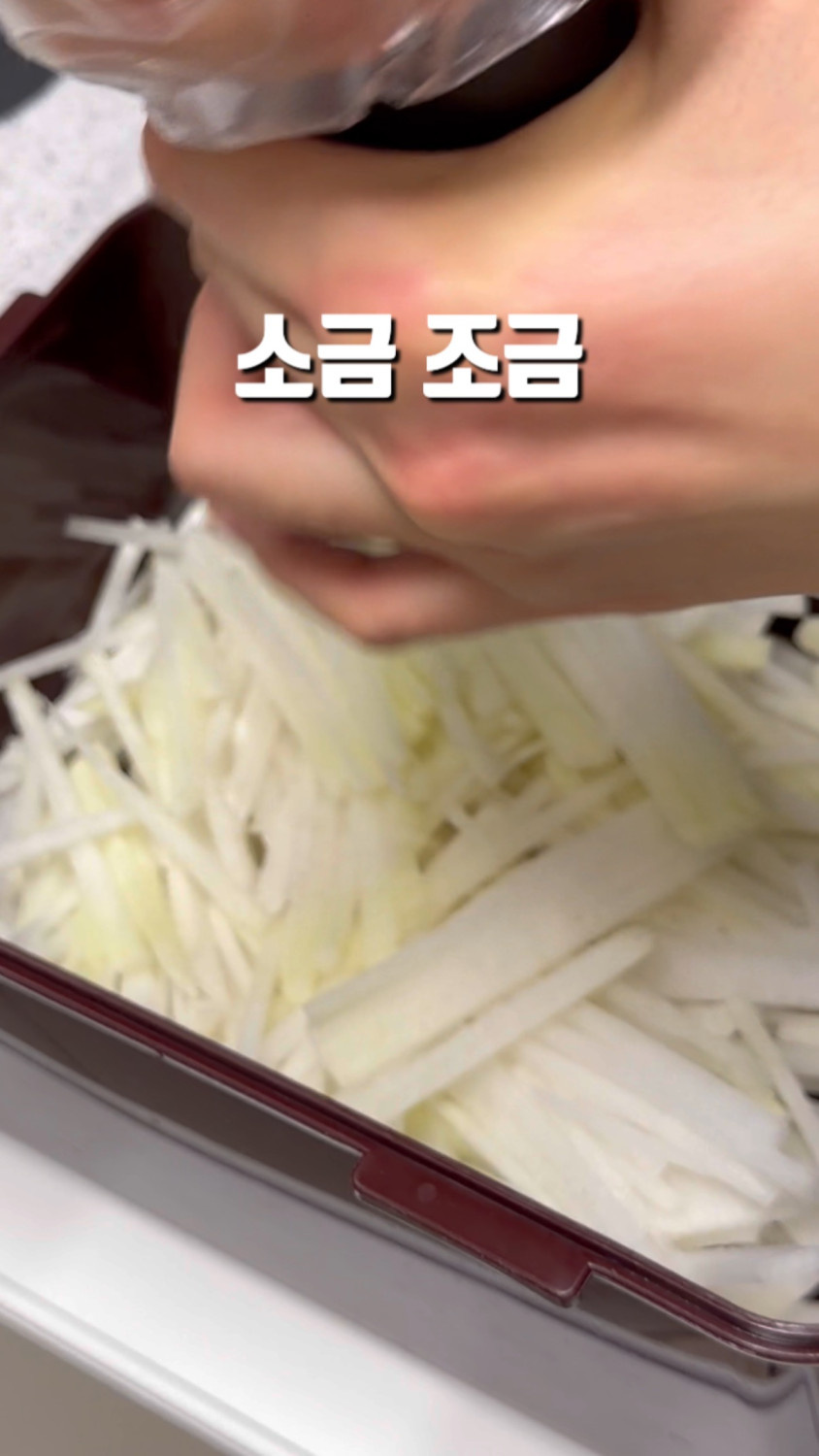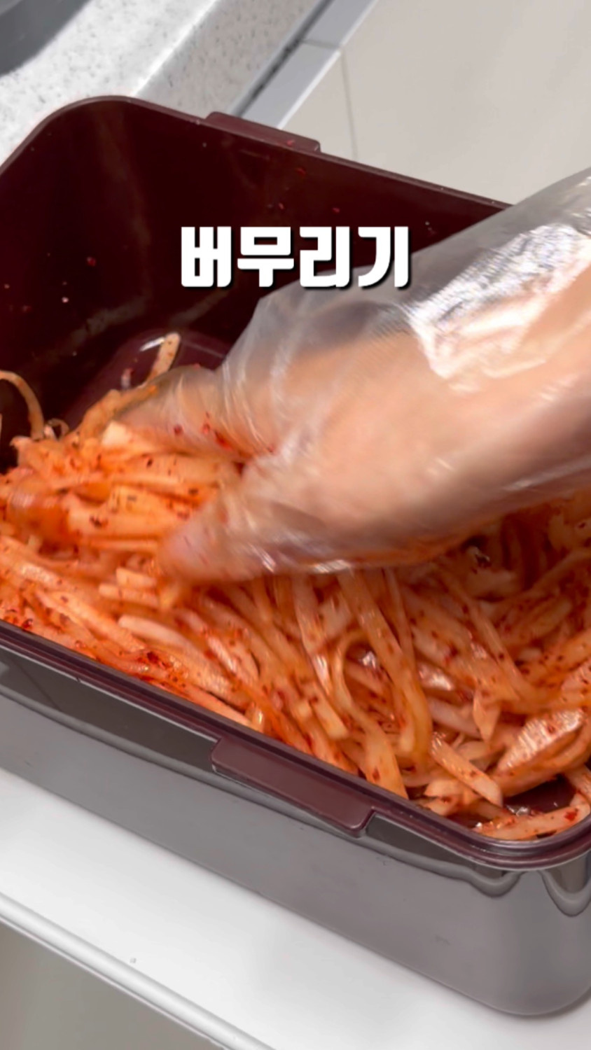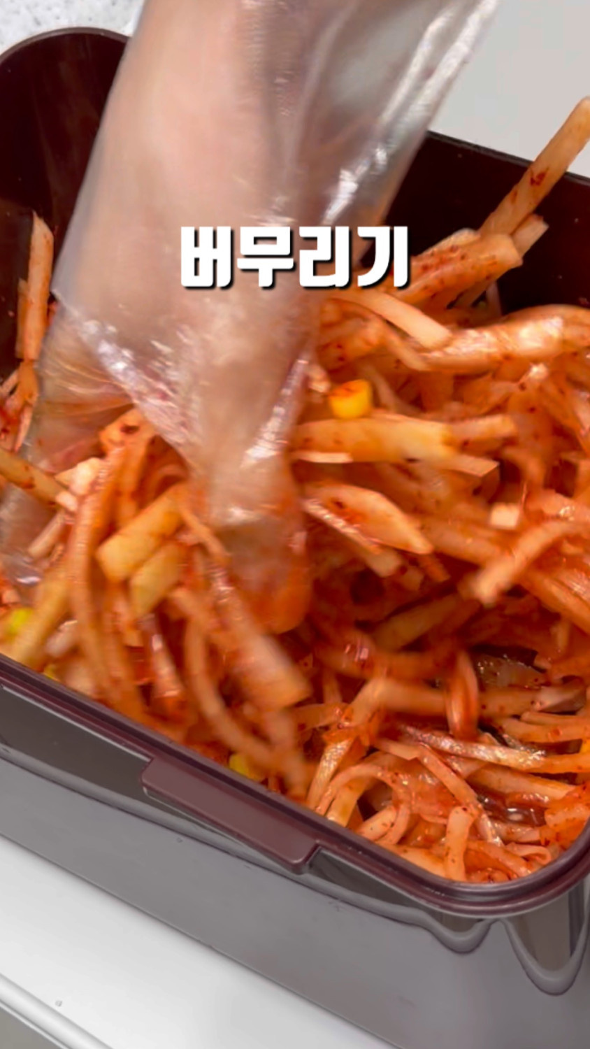 3분 정도 버무리면 무 숨이 죽고, 물이 나와요!