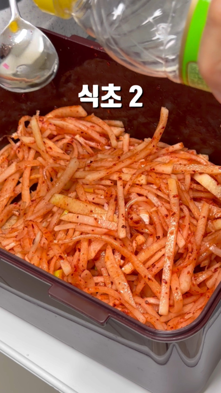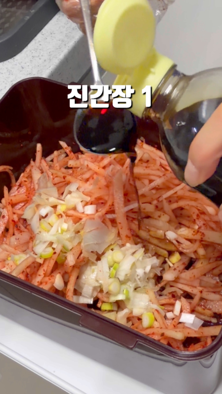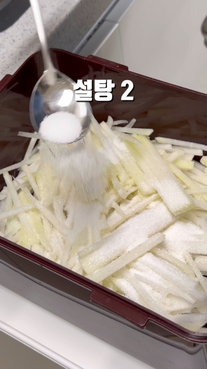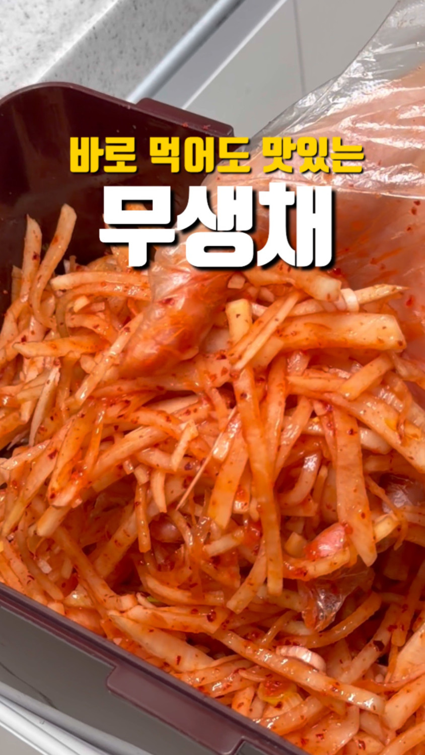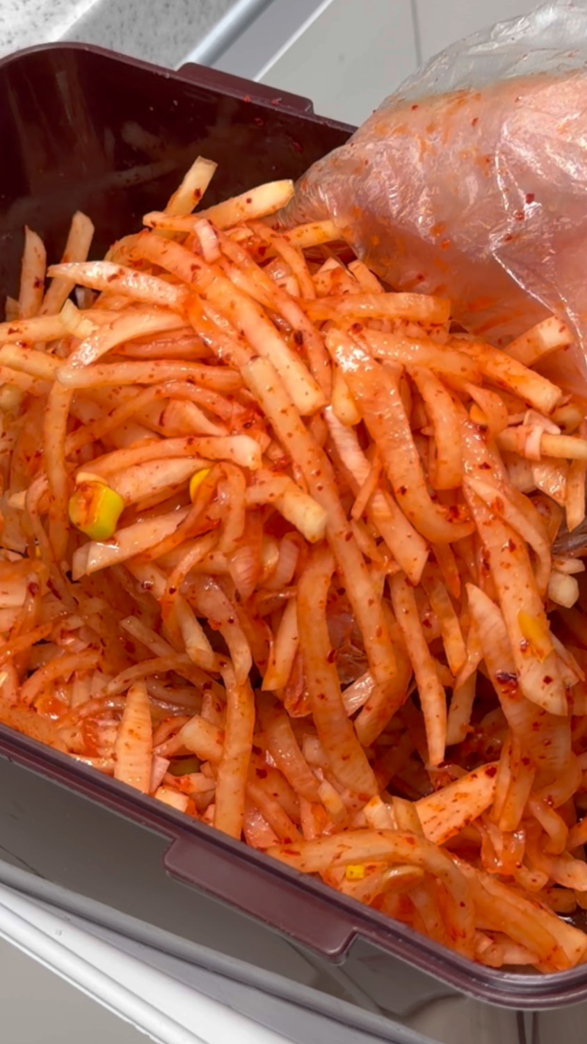 3분 정도 버무리면 무 숨이 죽고, 물이 나와요!