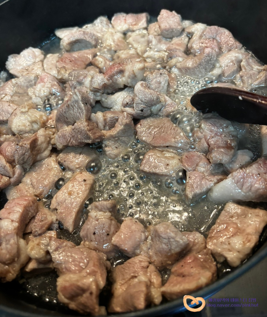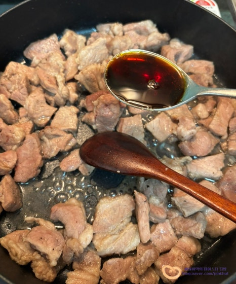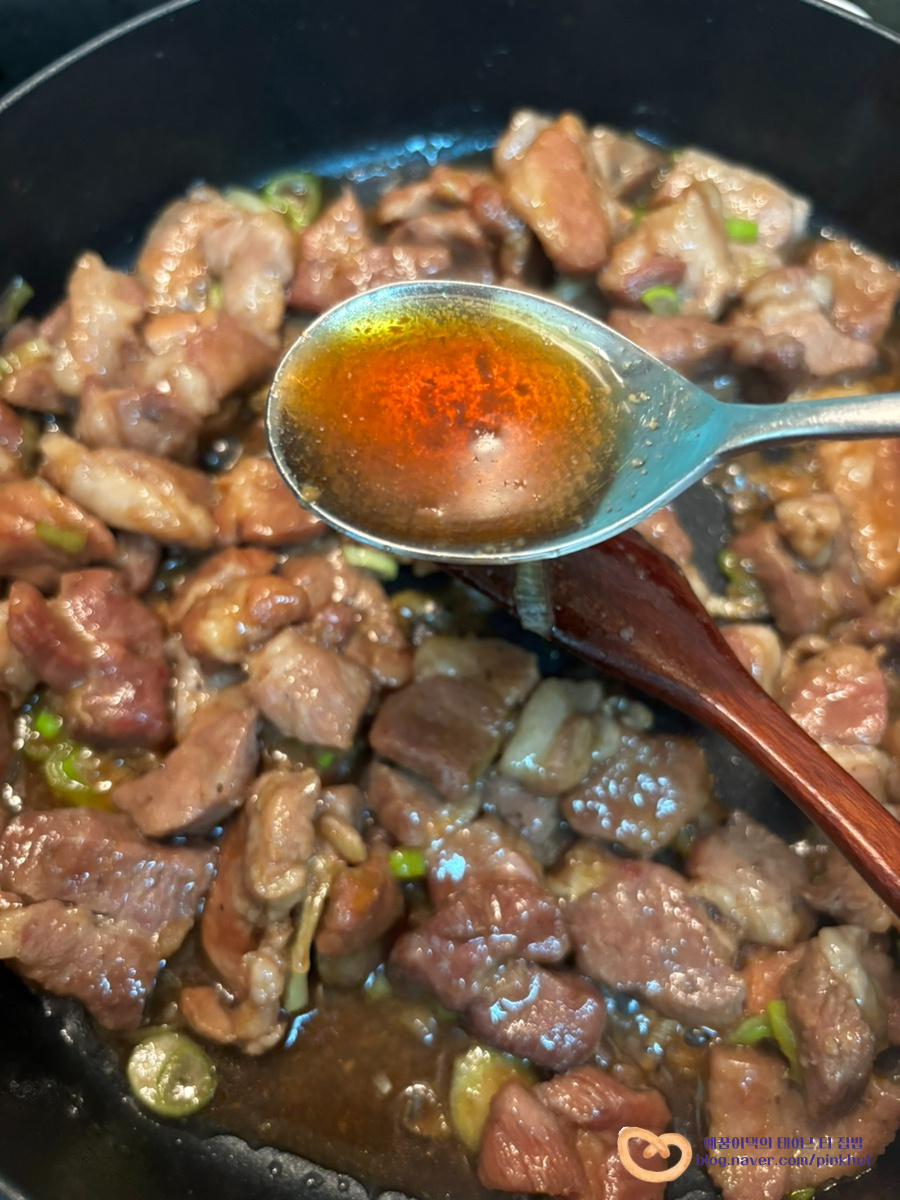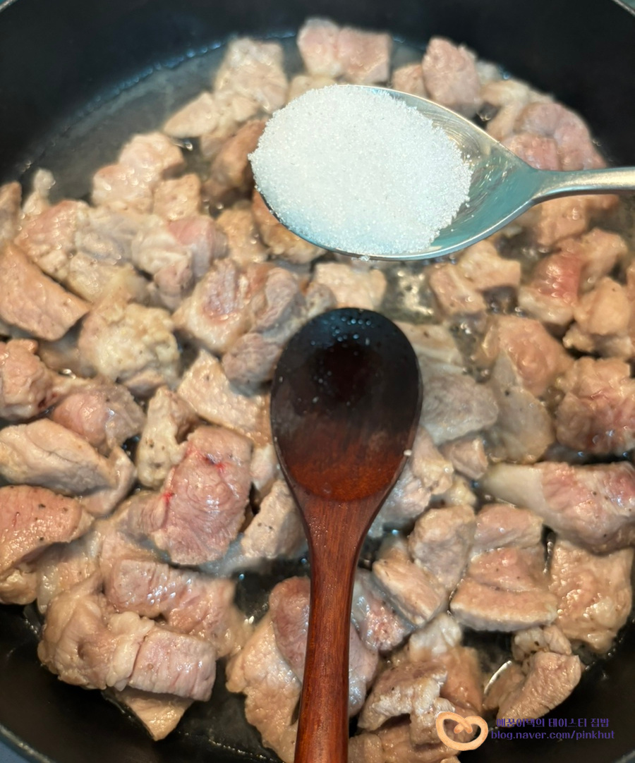 골고루 볶아주는데요, 설탕을 먼저 넣어 볶는 이유는 고기가 더 부드럽고 촉촉해지기 때문이에요