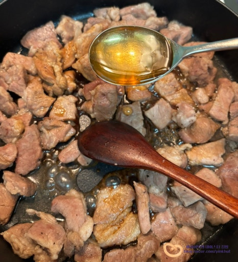 고기가 거의 익었으면 물 8T를 넣고 설탕 10g을 넣어주세요.
