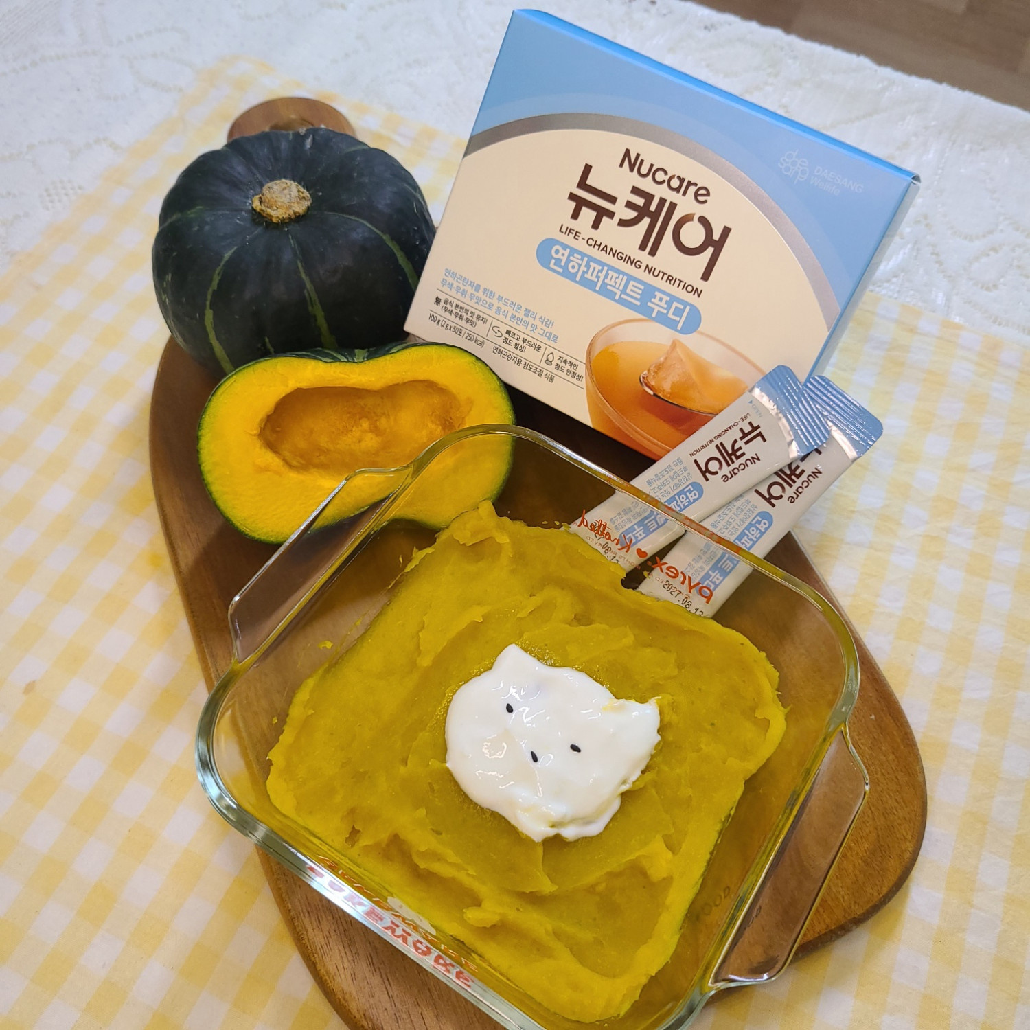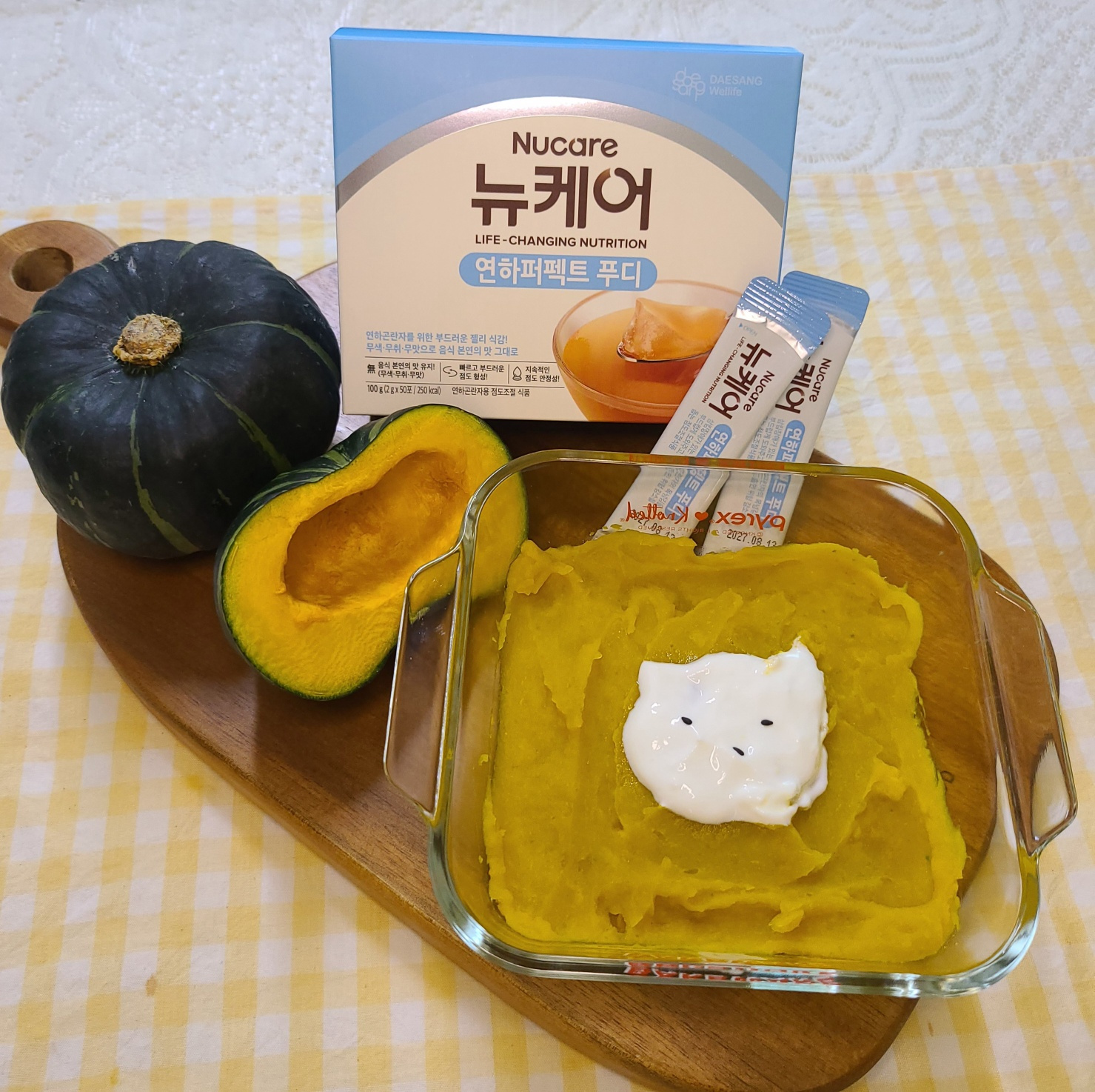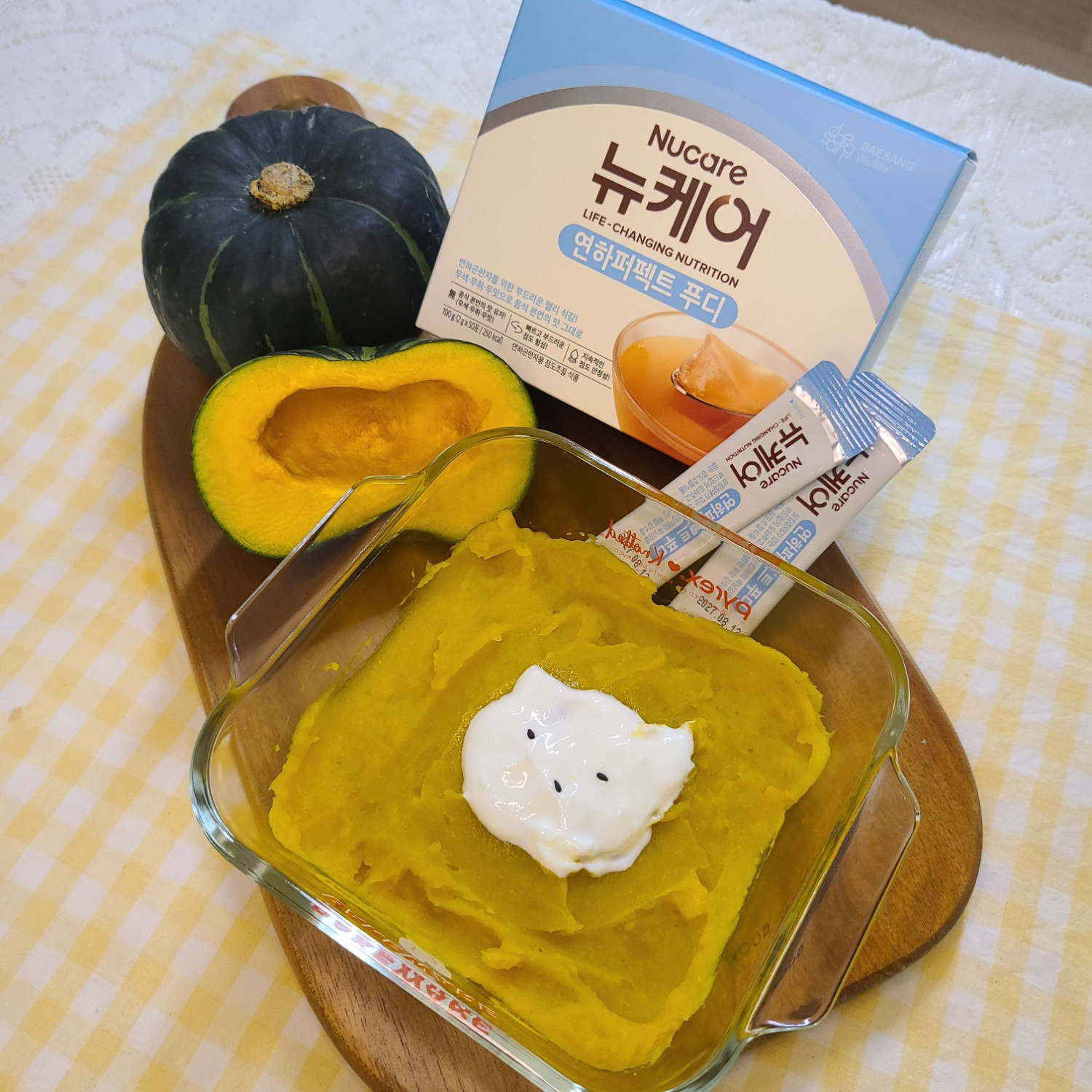 무염육수에 연하퍼펙트푸디 1포를 잘 녹여주시고 3번에 나눠 넣어 잘 섞어주셔요! 마지막으로 무가당 묽은 요거트 한 점 올리면