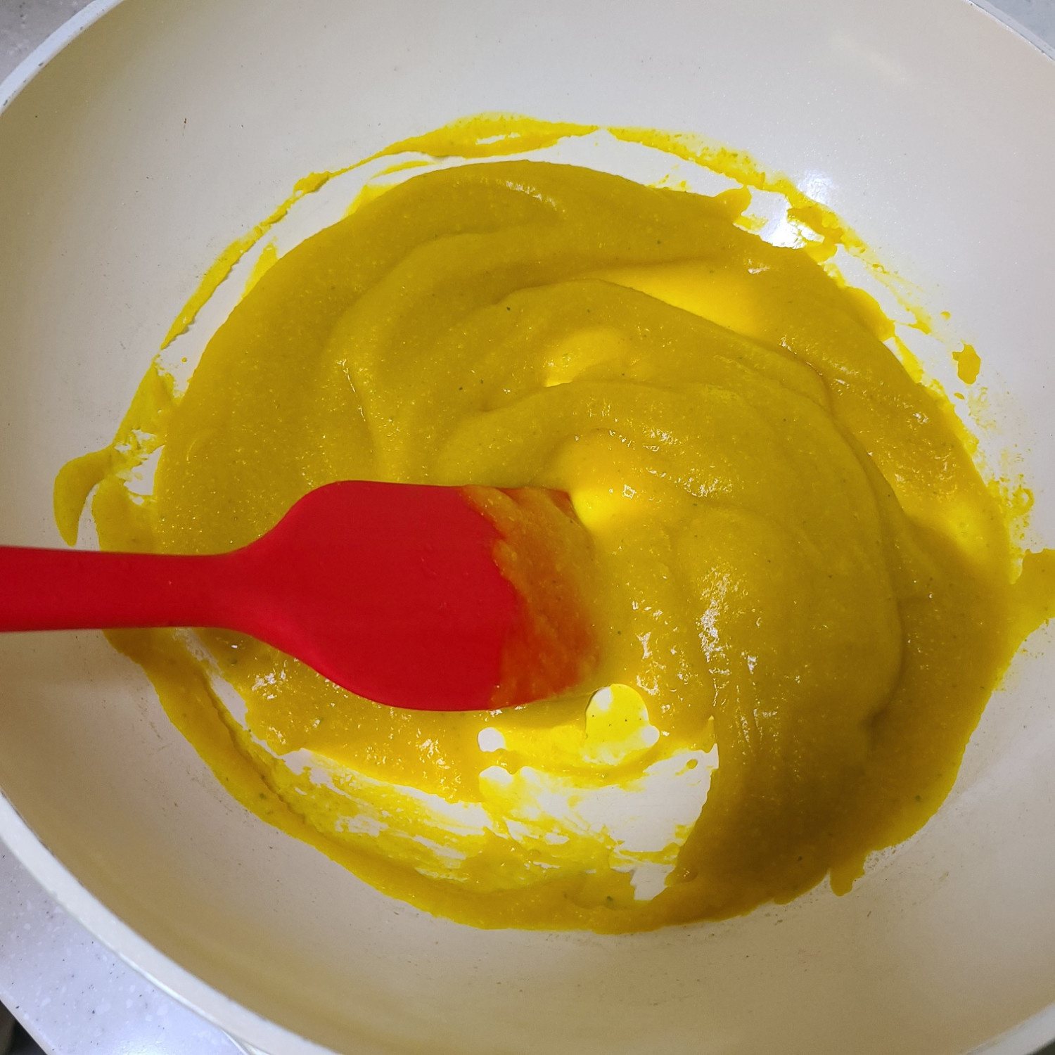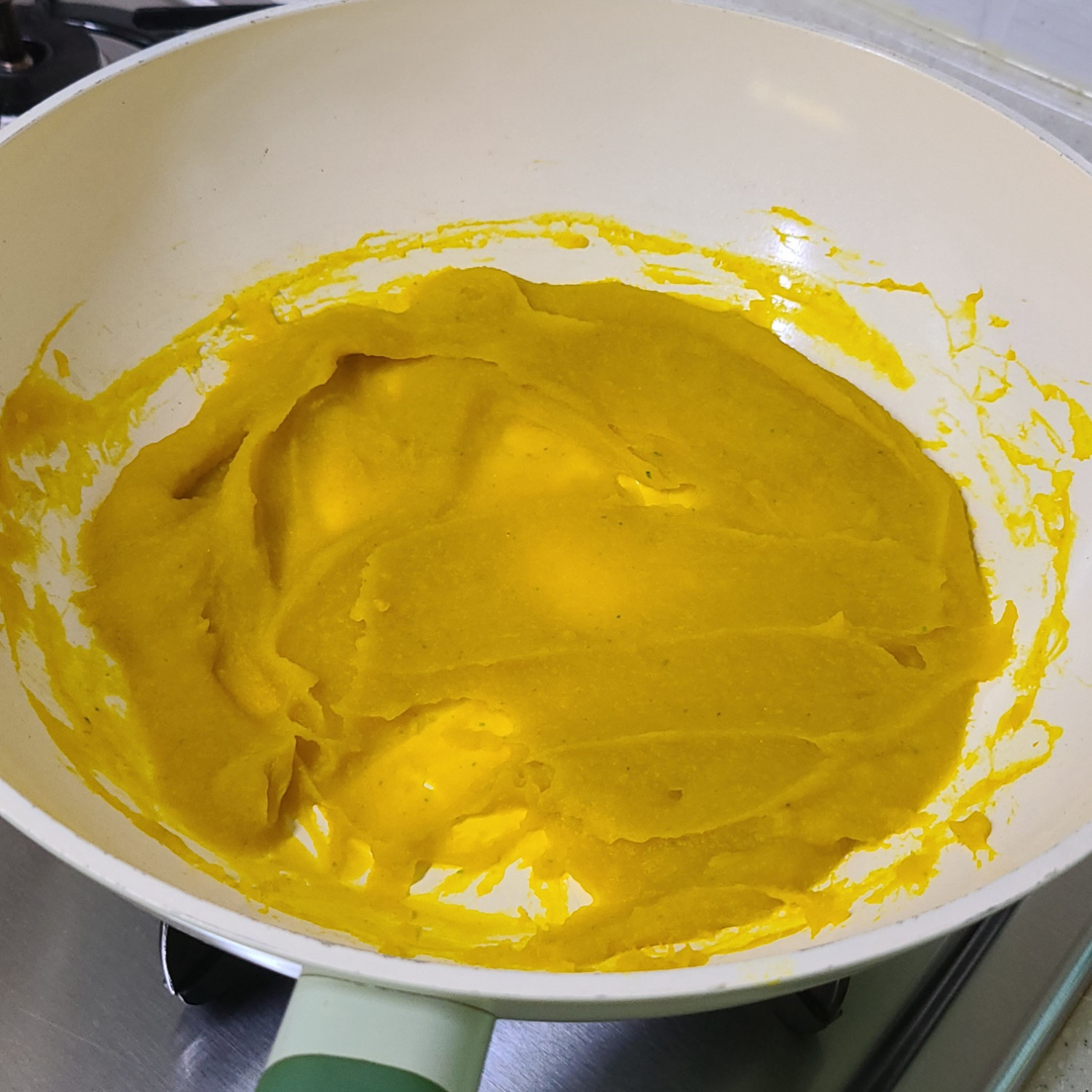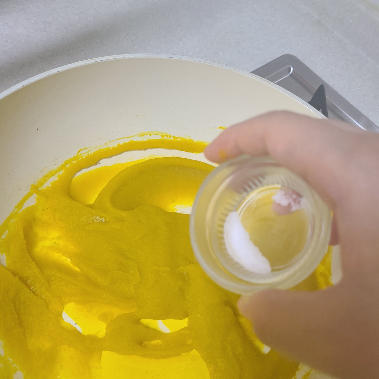 체에 거른 밤호박 무스를 약불에서 저어주다가 온도가 85이상 되면(약한 끓음 상태에서 보글보글 사이) 퍼펙트푸디 1포+육수 섞은 것을 3번에 나눠 넣어가며 3분 저어주고 불을 끈 뒤 소금 한 꼬집을 넣어 잘 섞어줍니다