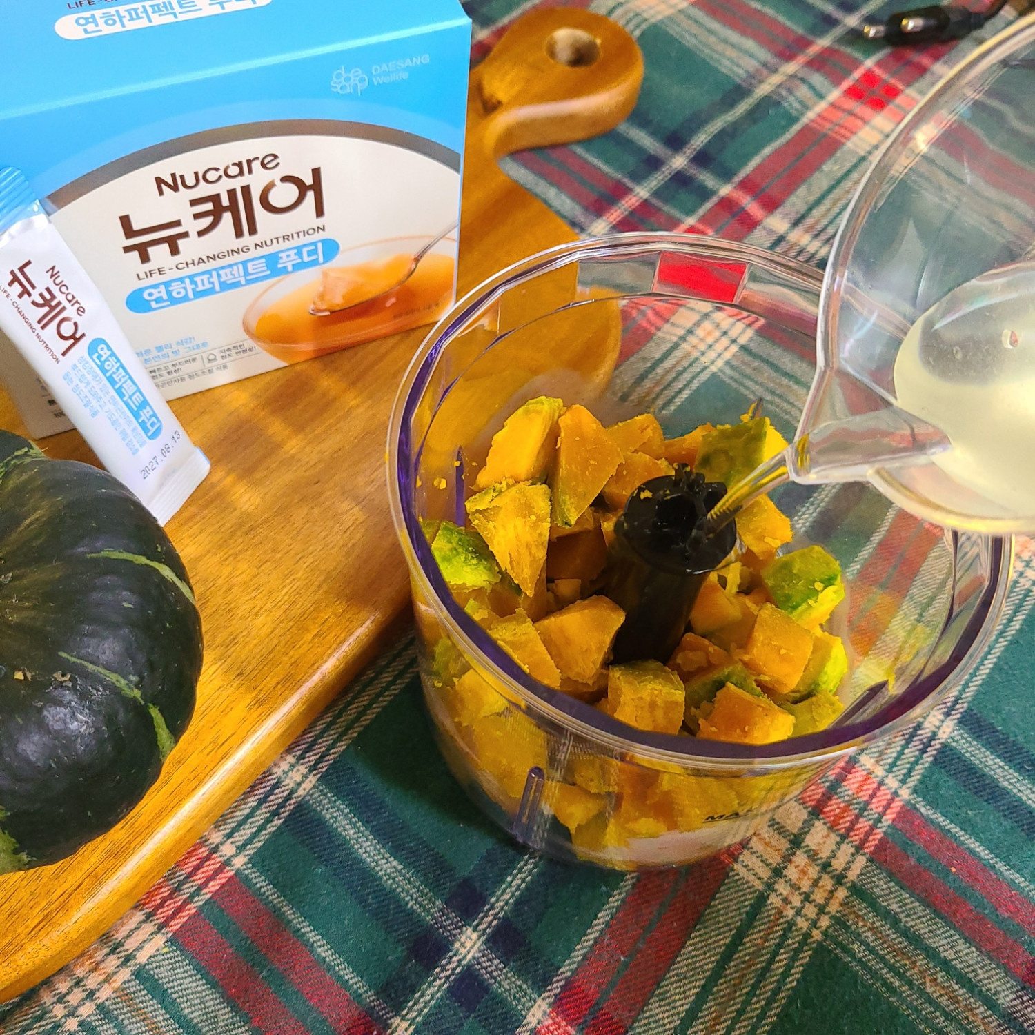 찌고 식힌 밤호박을 잘게 토막내서 블렌더에 넣고 식힌 무염 채소 육수 110ml를 넣고 곱게 갈아줍니다