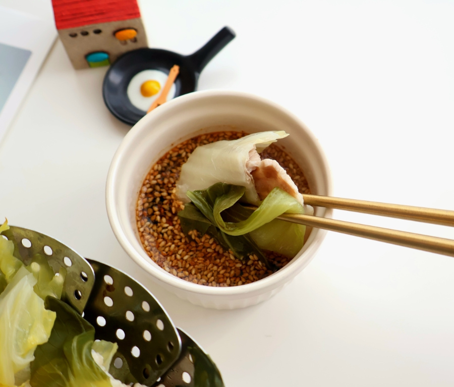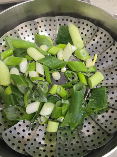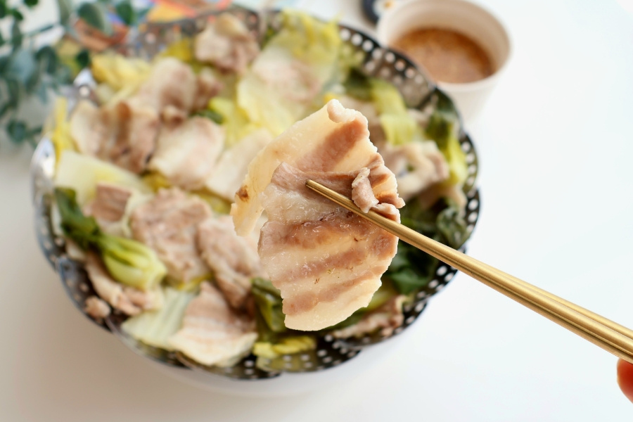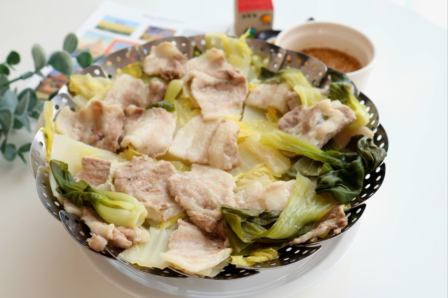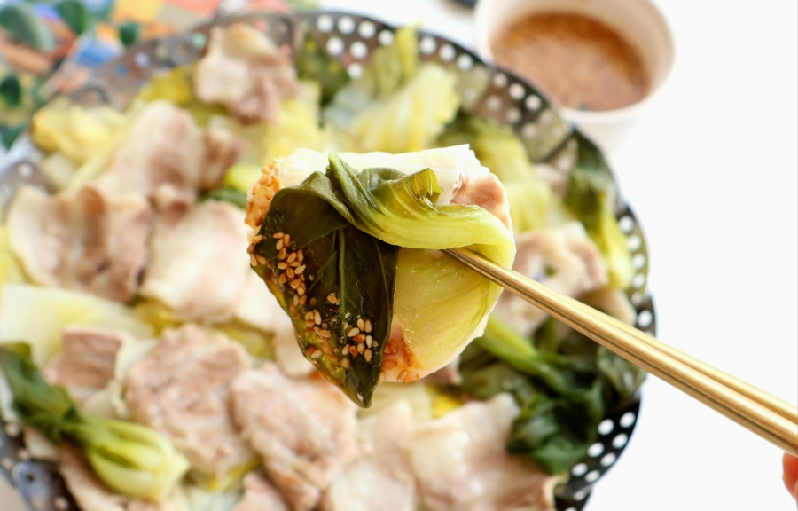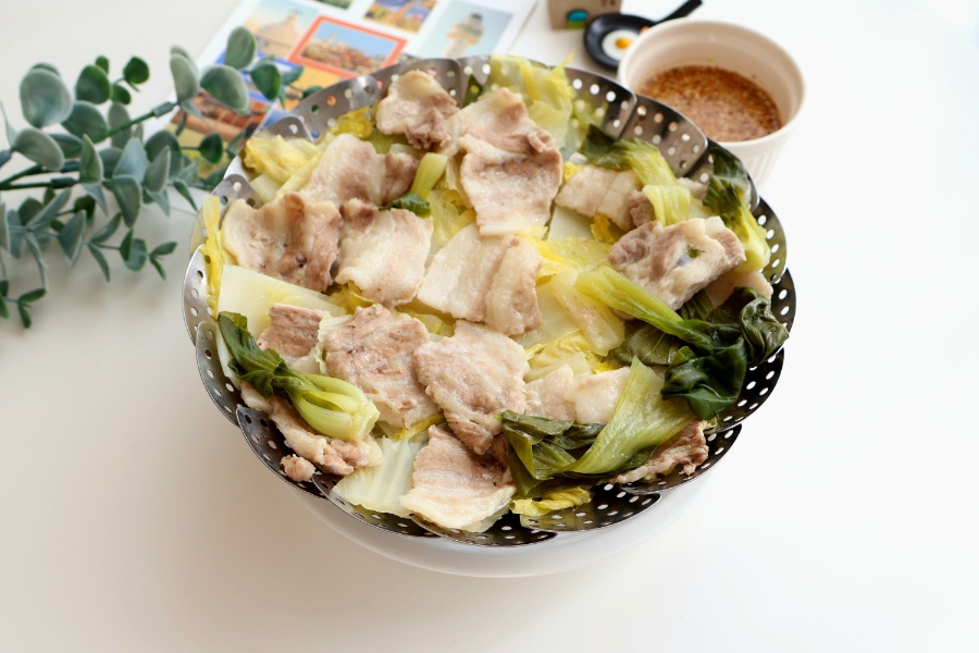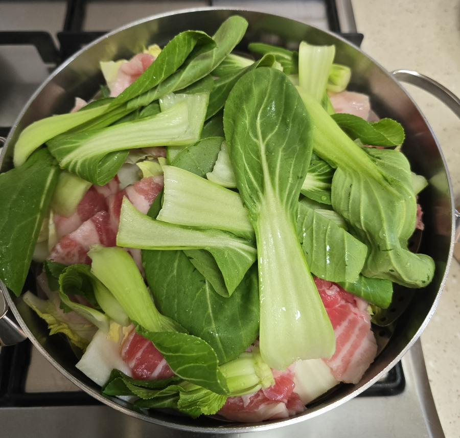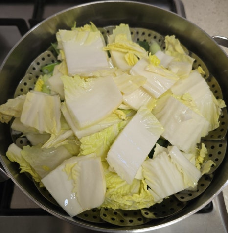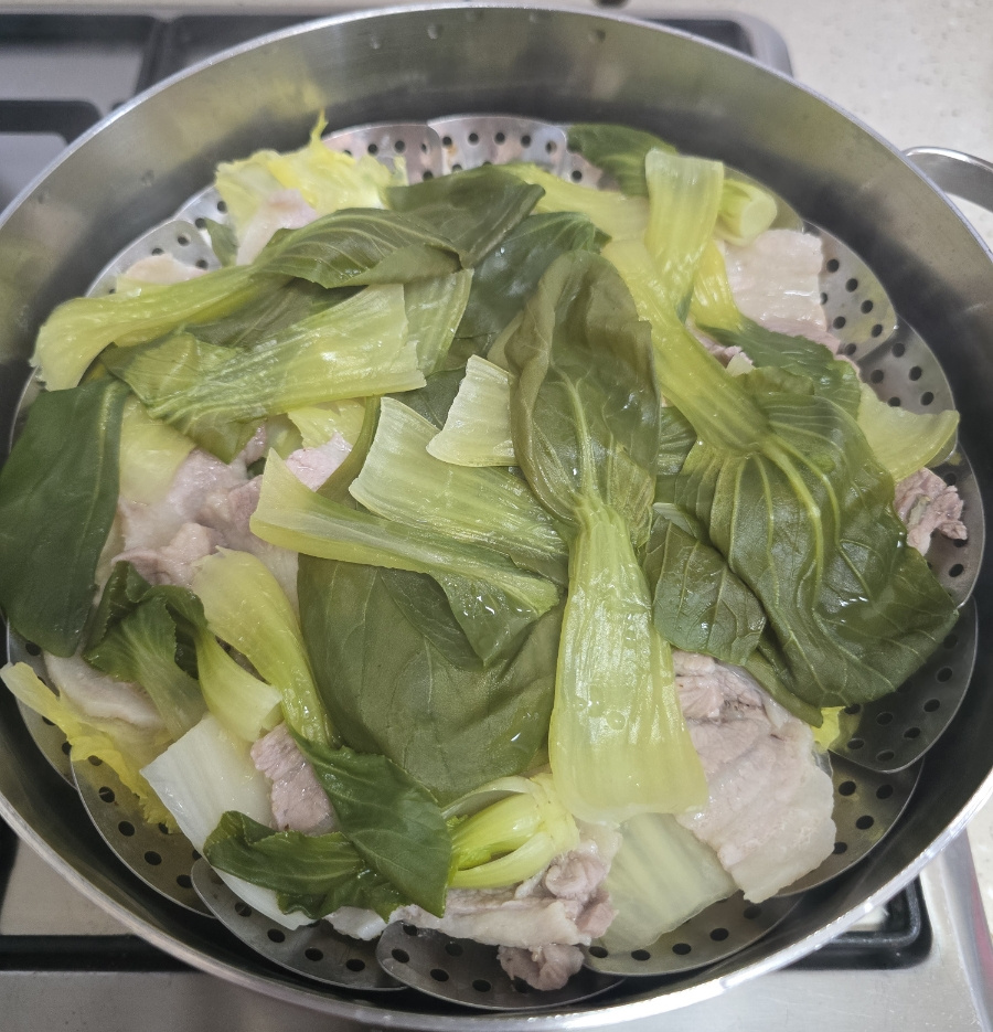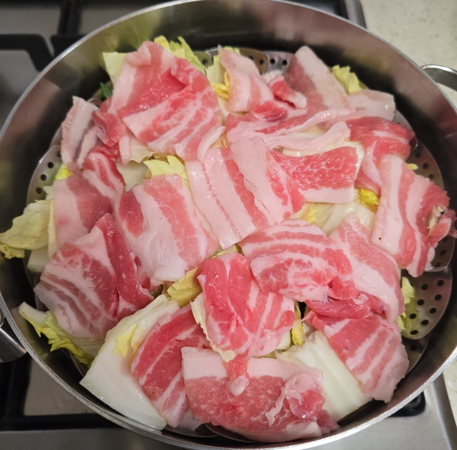 준비물은 간단해요. 달큼한 알배기 배추랑 야들야들한 대패삼겹살! 찜기에 배추 툭툭 썰어 깔고, 그 위에 고기를 구름처럼 얹어주세요.