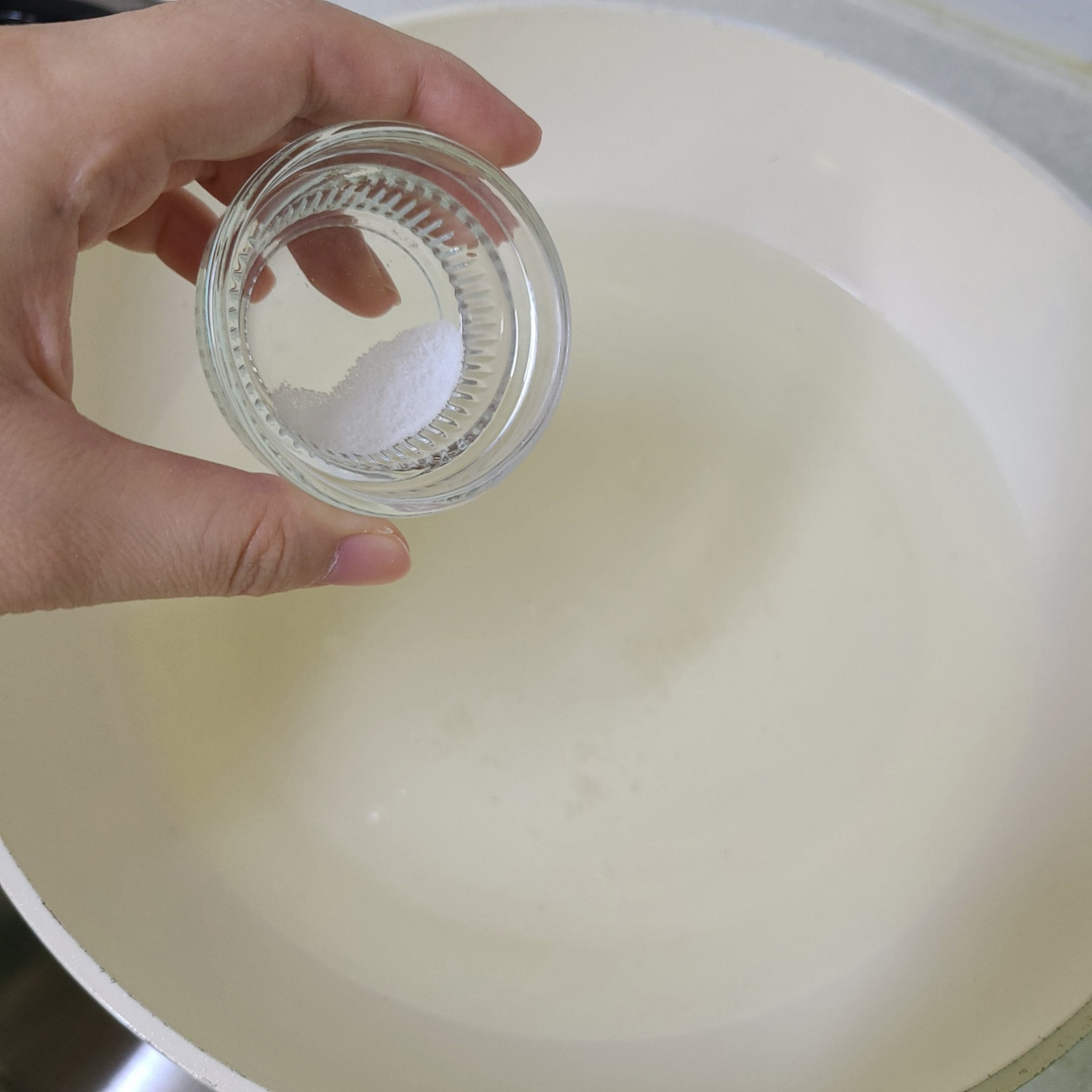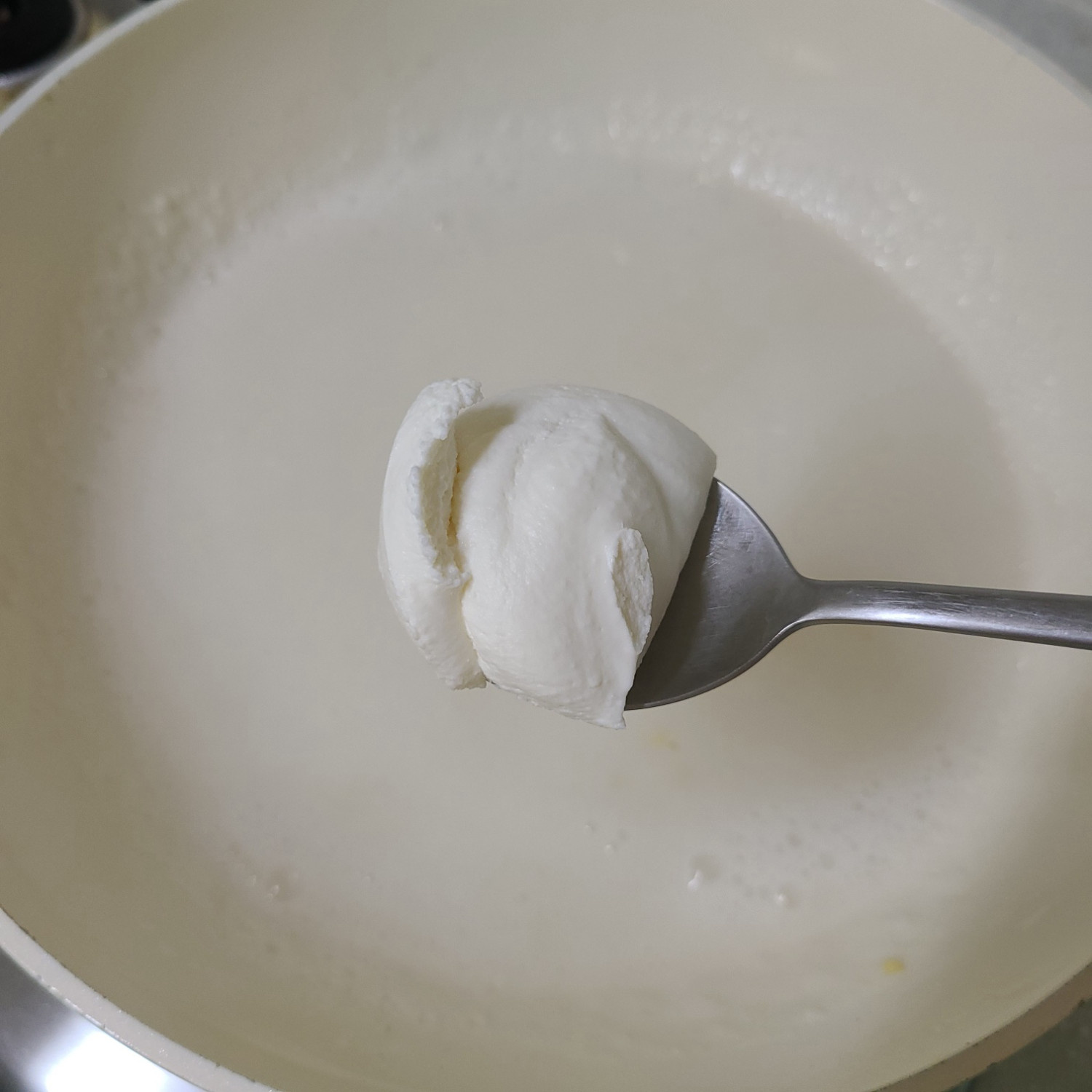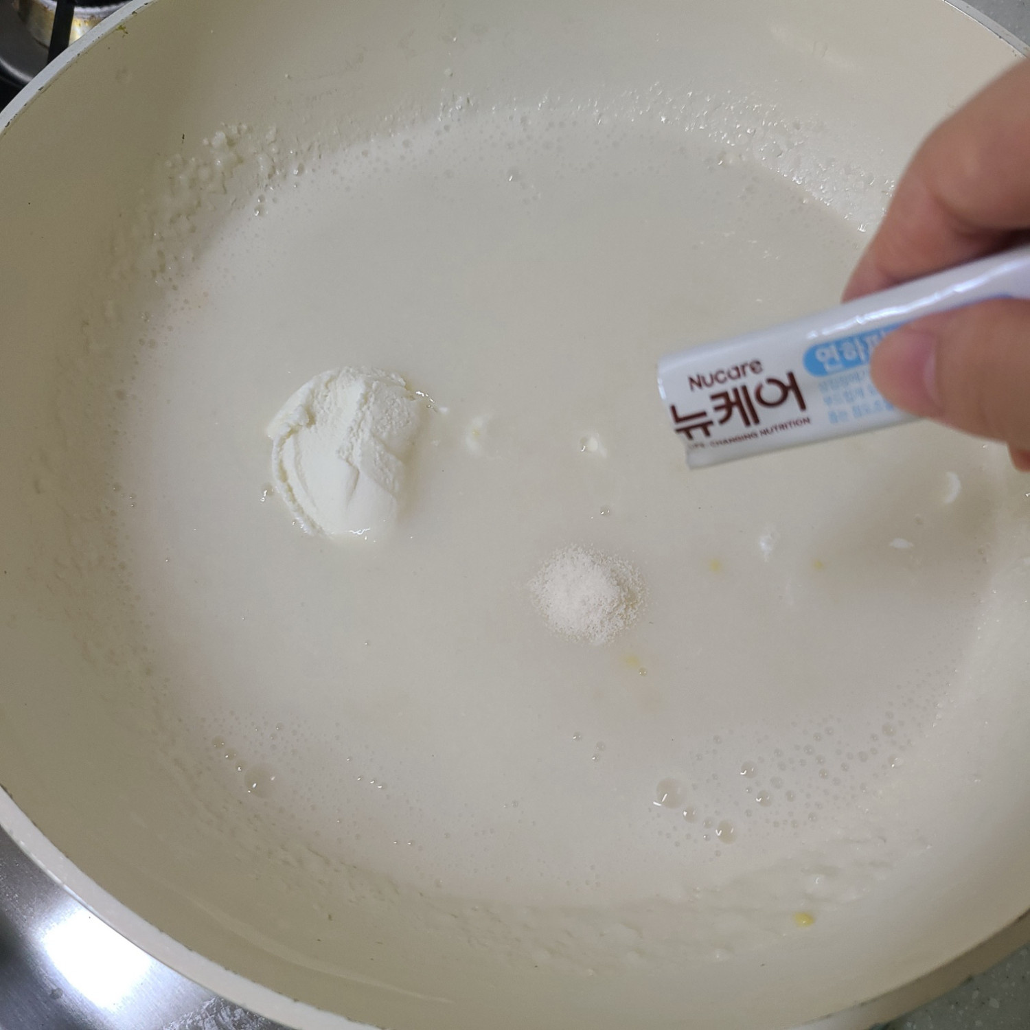 뭉치지 않고 섞였으면 불 끄고 리코타치즈 가득 1큰술+연하퍼펙트푸디 1포(2g)을 넣고 1분 기다렸다가 섞고 소금 한 꼬집으로 연하게 간해주세요