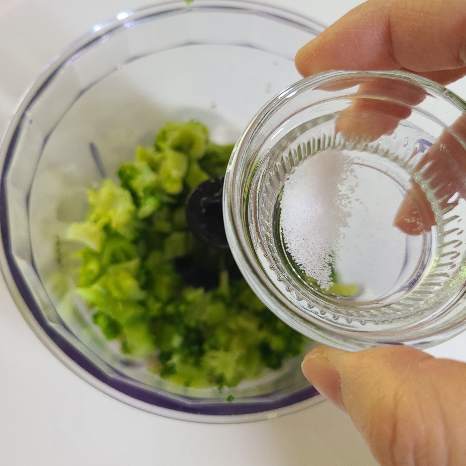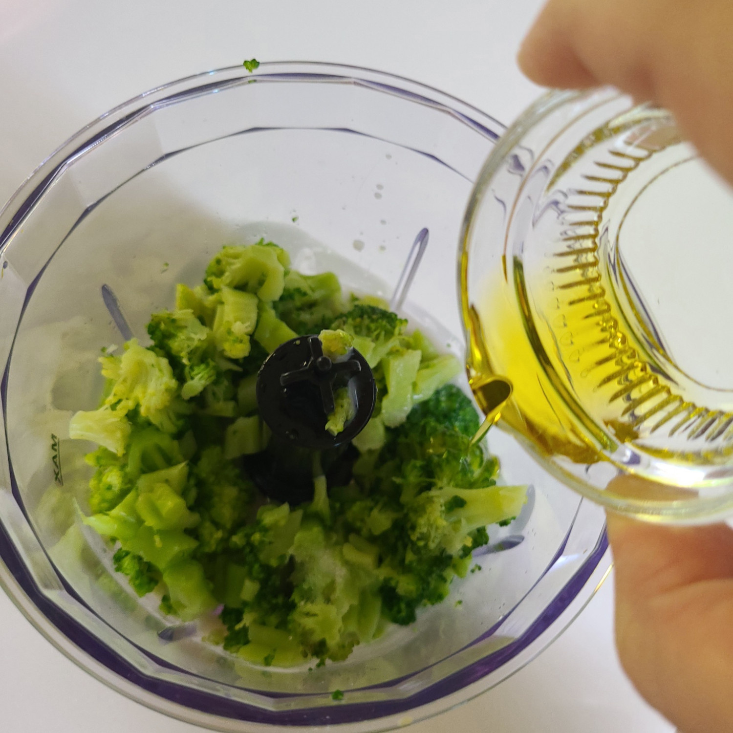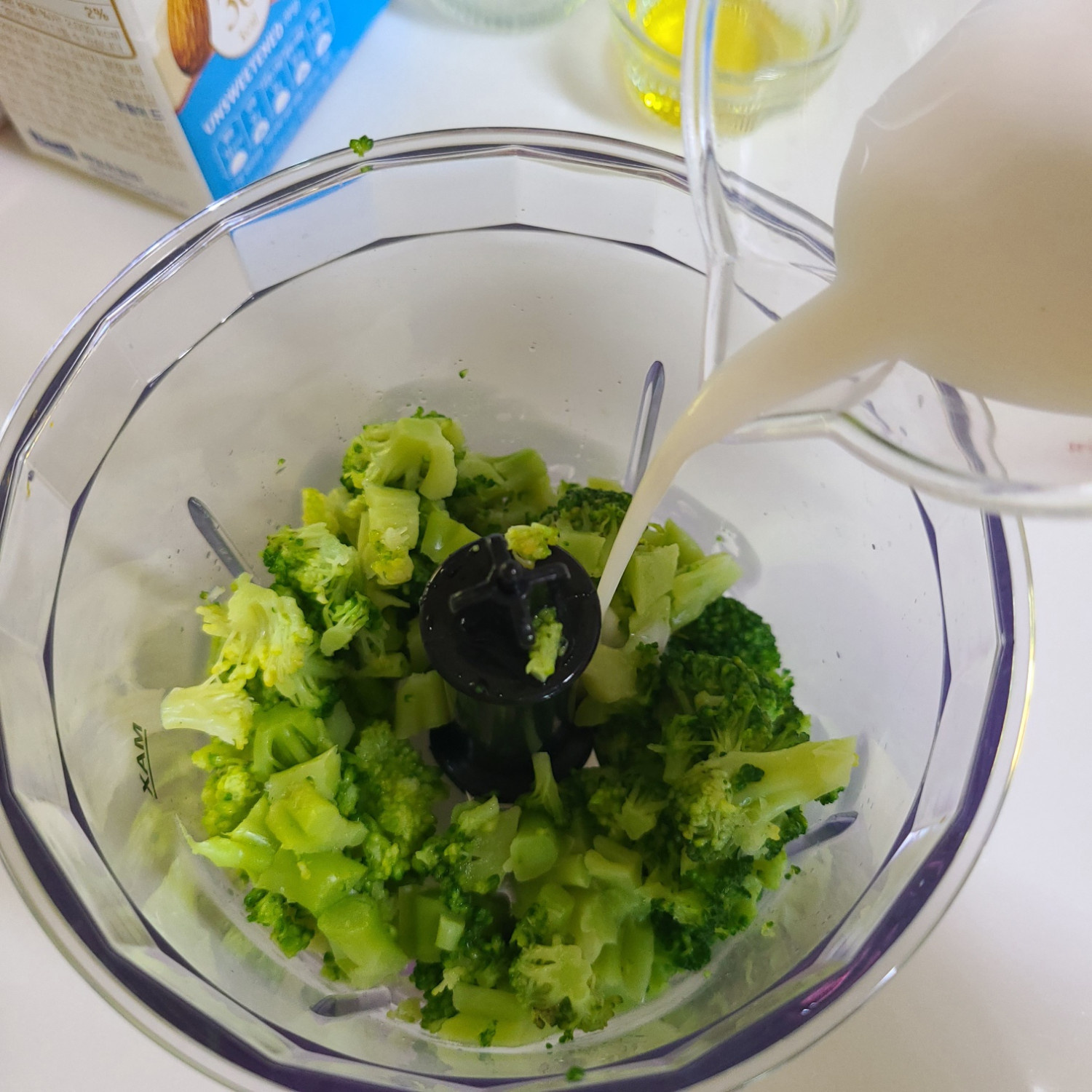 브로콜리를 갈기 편하게 살짝 잘라주고 블렌더에 넣은 후 설탕 안들어간 아몬드 우유 70ml+소금 한 꼬집+올리브유 2티스푼 넣고 완전히 갈아주세요 그 다음~