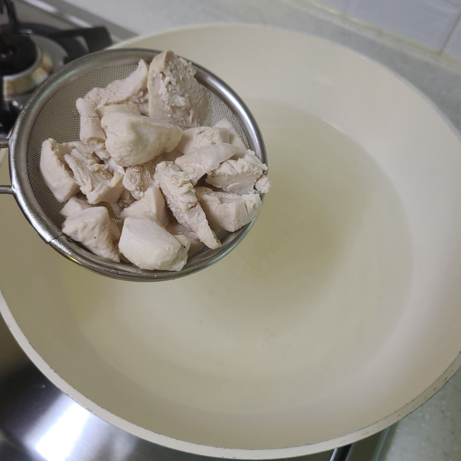 먼저 리조또에 쓸 육수인 닭육수를 만들건데요! 저는 이 레시피에 고기는 안 쓰고 육수만 썼어요 냄비에 800ml물을 넣고 끓으면 냉동 닭가슴살 150g 넣고 중약불~중불로 뚜껑 덮고 15분 삶아주세요 삶으면서 조각을 토막 내주시면 더 깊은 맛이나요 15분 지나면 닭은 빼주시고 불 끄고 소금 한 꼬집 섞어 무염닭육수 만들어줄께요~